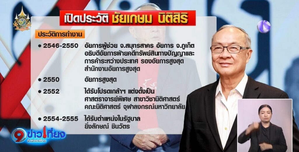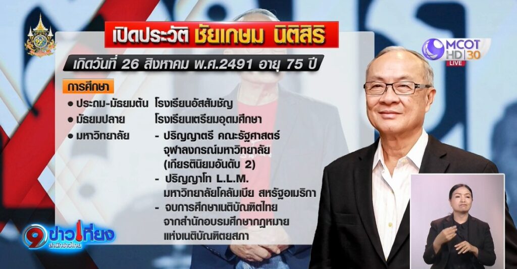 กรุงเทพฯ 15 ส.ค. – ย้อนเส้นทางชีวิต “ชัยเกษม นิติสิริ” จากอัยการสูงสุด สู่แคนดิเดตนายกรัฐมนตรี หลังมีกระแสข่าวว่าพรรคเพื่อไทยจะส่งชื่อลงชิงนายกรัฐมนตรีคนใหม่ ในวันที่ 16 สิงหาคมนี้
