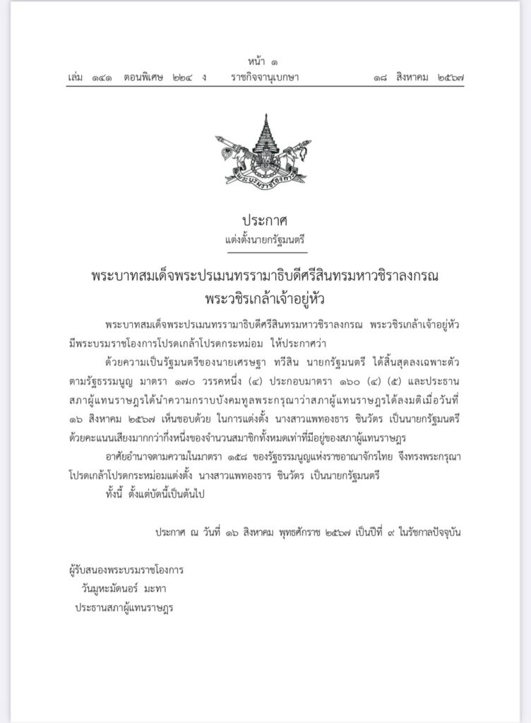 18 ส.ค.- ราชกิจจานุเบกษา เผยแพร่ประกาศพระบรมราชโองการ โปรดเกล้าฯ แต่งตั้ง “แพทองธาร ชินวัตร” เป็นนายกรัฐมนตรีคนที่ 31