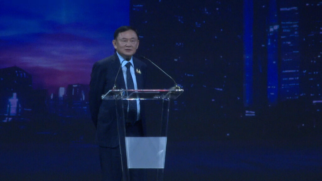 นายทักษิณ กล่าวว่า ไปอยู่เมืองนอก 17 ปี เหมือนไปเรียน ตอนนี้อายุ 75 เมื่อกลับมาบ้าน พบคนไทยไม่ค่อยยิ้มเหมือนเดิม เพราะหนี้สินมาก และโอกาสทางเศรษฐกิจน้อย ลูกติดยา แม่ติดหวย พ่อติดสุรา ทำให้พลังสังคมลดลง ทั้งนี้ นายทักษิณ มองคนไทยติดกับดักหนี้ ต้องเร่งแก้ปัญหา รวมทั้งปัญหายาเสพติด ควรหาคนเป็นเจ้าภาพและแก้ปัญหา