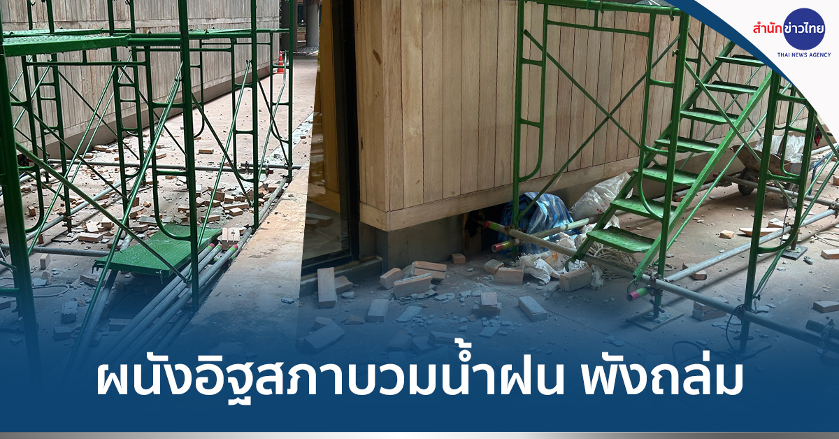 รัฐสภา 23 ส.ค.- ระทึก ‘ผนังอิฐสภา’ บวมน้ำฝนถึงที่ร่วงครืนเสียงดังสนั่น ระหว่างช่างก่อสร้างกำลังขึ้นนั่งร้านซ่อมแซม โชคยังดี 2 คนงานบาดเจ็บแค่เล็กน้อย ‘คิ้วแตก-หลังถลอก’