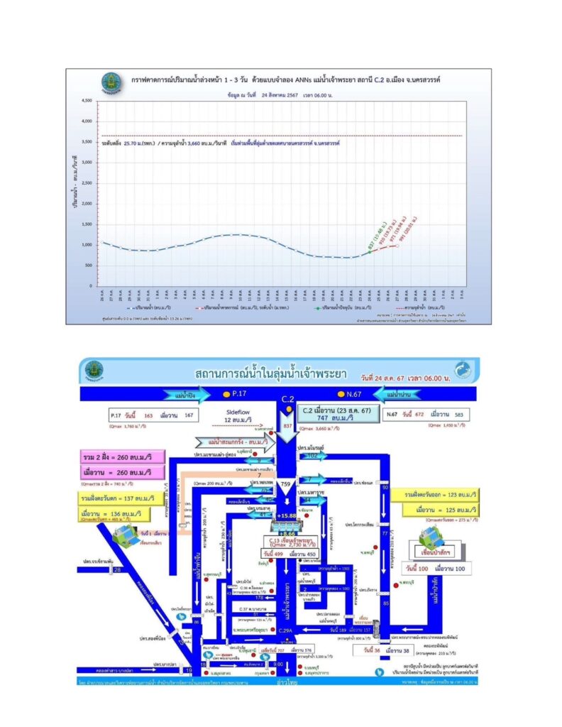 25 ส.ค. 67 เวลา 16.00 น. กระทรวงมหาดไทย โดยกรมป้องกันและบรรเทาสาธารณภัย (ปภ.) ประสาน 10 จังหวัด ภาคกลาง ได้แก่ อุทัยธานี ชัยนาท สิงห์บุรี อ่างทอง สุพรรณบุรี พระนครศรีอยุธยา ลพบุรี ปทุมธานี นนทบุรี และสมุทรปราการ รวมถึงกรุงเทพมหานคร เฝ้าระวังสถานการณ์ระดับน้ำในแม่น้ำเจ้าพระยาเพิ่มสูงขึ้น ตั้งแต่วันที่ 26 สิงหาคม 2567 เป็นต้นไป โดยให้จัดเจ้าหน้าที่ติดตามเฝ้าระวังติดตามสถานการณ์น้ำอย่างใกล้ชิด โดยเฉพาะพื้นที่ลุ่มต่ำนอกคันกั้นน้ำ พร้อมประชาสัมพันธ์แจ้งเตือนประชาชนที่อาศัยอยู่ริมสองฝั่งแม่น้ำเจ้าพระยา จุดเสี่ยงที่ลุ่มต่ำริมแม่น้ำให้เฝ้าระวังระดับน้ำและเตรียมพร้อมรับมือสถานการณ์น้ำ รวมถึงแจ้งจังหวัดประสานท้องถิ่นและหน่วยงานที่เกี่ยวข้องตรวจสอบแนวคันกั้นน้ำ จัดเตรียมวัสดุอุปกรณ์ เครื่องจักรกลด้านสาธารณภัย เจ้าหน้าที่ติดตามเฝ้าระวังสถานการณ์ และเตรียมความพร้อมปฏิบัติการให้ความช่วยเหลือประชาชน ตลอด 24 ชั่วโมง