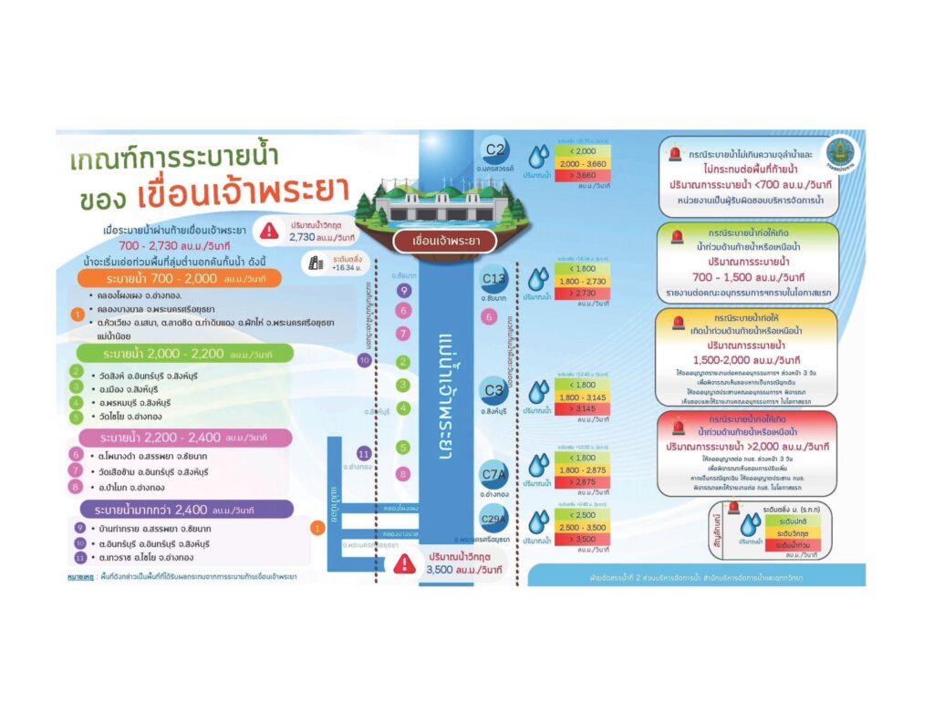 กองอำนวยการป้องกันและบรรเทาสาธารณภัยกลาง (กอปภ.ก.) จึงได้ประสาน 10 จังหวัดภาคกลาง ได้แก่ อุทัยธานี ชัยนาท สิงห์บุรี อ่างทอง สุพรรณบุรี พระนครศรีอยุธยา ลพบุรี ปทุมธานี นนทบุรี และสมุทรปราการ รวมถึงกรุงเทพมหานคร เฝ้าระวังติดตามสถานการณ์น้ำอย่างใกล้ชิด โดยเฉพาะพื้นที่ลุ่มต่ำนอกคันกั้นน้ำ พร้อมประชาสัมพันธ์แจ้งเตือนหน่วยงานที่เกี่ยวข้อง ภาคเอกชนที่ประกอบกิจการในแม่น้ำ อาทิ งานก่อสร้างเขื่อนป้องกันตลิ่ง แพร้านอาหาร ตลอดจนประชาสัมพันธ์แจ้งเตือนประชาชนที่อาศัยอยู่ริมสองฝั่งแม่น้ำเจ้าพระยา จุดเสี่ยงที่ลุ่มต่ำริมแม่น้ำให้เฝ้าระวังระดับน้ำที่เพิ่มสูงขึ้นและเตรียมพร้อมรับมือสถานการณ์น้ำ รวมถึงเตรียมพร้อมในการขนย้ายสิ่งของขึ้นที่สูงให้พ้นจาก แนวน้ำท่วม นอกจากนี้ ยังได้ประสานองค์กรปกครองส่วนท้องถิ่นและหน่วยงานที่เกี่ยวข้องในพื้นที่ ตรวจสอบแนวคันกั้นน้ำและแนวป้องกันน้ำท่วมให้มีความแข็งแรง เพื่อป้องกันระดับน้ำล้นข้ามแนวคันกั้นน้ำ อีกทั้งจัดเตรียมวัสดุอุปกรณ์ เครื่องจักรกลด้านสาธารณภัย เพื่อเตรียมความพร้อมปฏิบัติการให้ความช่วยเหลือประชาชนตลอด 24 ชั่วโมง