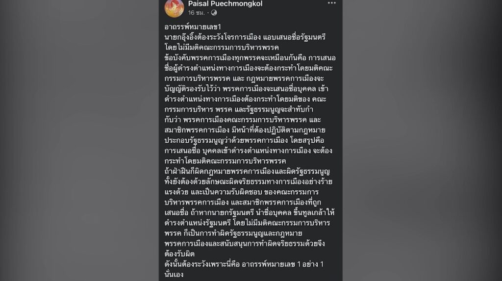 นายไพศาล พืชมงคล นักกฎหมาย โพสต์เฟซบุ๊กเรื่อง “อาถรรพ์ 319 เอาแล้ว” ระบุว่า…อาถรรพ์ 319 เอาแล้ว มีผู้ร้องต่อ กกต. ขอให้ยุบพรรคเพื่อไทย และตัดสิทธิทางการเมืองนายกฯ อุ๊งอิ๊ง ฐานยอมให้นายทักษิณครอบงำพรรค โดยผ่านทางอดีตนายกฯ เศรษฐา ให้แต่งตั้งนายพิชิต ชื่นบาน เป็นรัฐมนตรี โดยขัดต่อรัฐธรรมนูญ และอ้างคำวินิจฉัยของศาลรัฐธรรมนูญ ในการถอดถอนนายกฯ เศรษฐา เป็นหลักฐาน ถ้ามีการยุบพรรค นายกฯ อุ๊งอิ๊ง จะถูกตัดสิทธิทางการเมืองด้วย อย่าทำเป็นเล่นกับพวกช่างร้องเป็นอันขาด นักร้องเป็นใครไม่รู้ ยิ่งผู้ลึกลับที่อยู่เบื้องหลังนักร้องยิ่งไม่รู้ใหญ่ เมื่อไม่รู้ว่ารบกับใครก็ยากที่จะได้ชัยชนะ