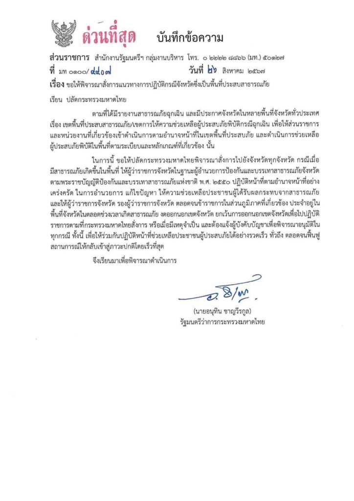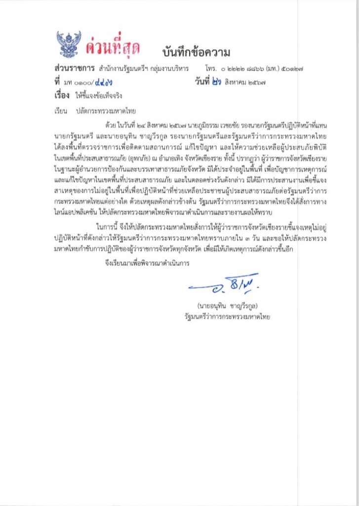 กระทรวงมหาดไทย ออกหนังสือด่วนที่สุด เรื่องให้ชี้แจงข้อเท็จจริง เนื่องด้วยวันเสาร์ที่ 24 สิงหาคม 2567 นายภูมิธรรม เวชยชัย รองนายกรัฐมนตรีและรัฐมนตรีว่าการกระทรวงพาณิชย์ ปฏิบัติหน้าที่นายกรัฐมนตรี และนายอนุทิน ชาญวีรกูล รองนายกรัฐมนตรีและรัฐมนตรีว่าการกระทรวงมหาดไทย ลงพื้นที่ไปยังจังหวัดเชียงรายเพื่อติดตาม แก้ไขปัญหา และช่วยเหลือประชาชนจากสถานการณ์อุทกภัย ที่อำเภอเทิง จังหวัดเชียงราย และพบว่าผู้ว่าราชการจังหวัดเชียงราย ในฐานะผู้อำนวยการป้องกันและบรรเทาสาธารณภัยจังหวัด ไม่ประจำในพื้นที่ เพื่อบัญชาการเหตุการณ์ และเร่งแก้ไขปัญหา และตลอดทั้งวัน ไม่มีการประสานงานเพื่อชี้แจงข้อเท็จจริง สาเหตุของการไม่อยู่ในพื้นที่