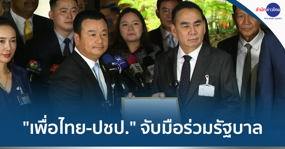 นายสรวงศ์ เทียนทอง เลขาธิการพรรคเพื่อไทย นำหนังสือเทียบเชิญพรรคประชาธิปัตย์เข้าร่วมรัฐบาลมามอบให้กับนายเดชอิศม์ ขาวทอง เลขาธิการพรรคประชาธิปัตย์ ต่อหน้าสื่อมวลชน ท่ามกลางพยานจาก สส.ทั้งสองฝ่าย จับมือจะตั้งรัฐบาล