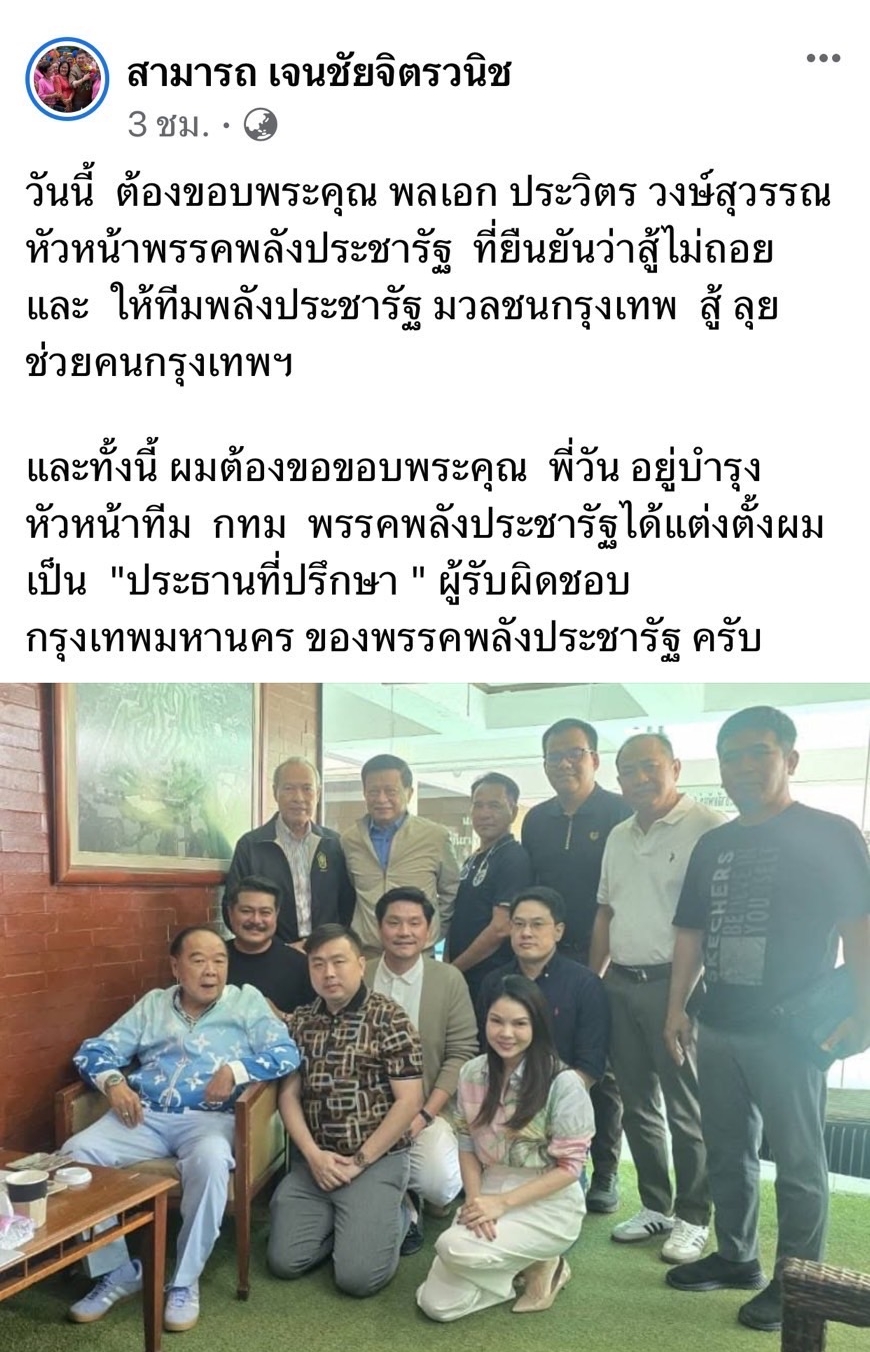 “วันนี้ต้องขอบพระคุณ พล.อ.ประวิตร วงษ์สุวรรณ หัวหน้าพรรคพลังประชารัฐ ที่ยืนยันว่าสู้ไม่ถอย และให้ทีมพลังประชารัฐ มวลชนกรุงเทพ สู้ ลุยช่วยคนกรุงเทพฯ และต้องขอขอบพระคุณ พี่วัน อยู่บำรุง หัวหน้าทีม กทม. พรรคพลังประชารัฐ แต่งตั้งผมเป็นประธานที่ปรึกษา ผู้รับผิดชอบกรุงเทพมหานคร ของพรรคพลังประชารัฐ” นายสามารถ ระบุ