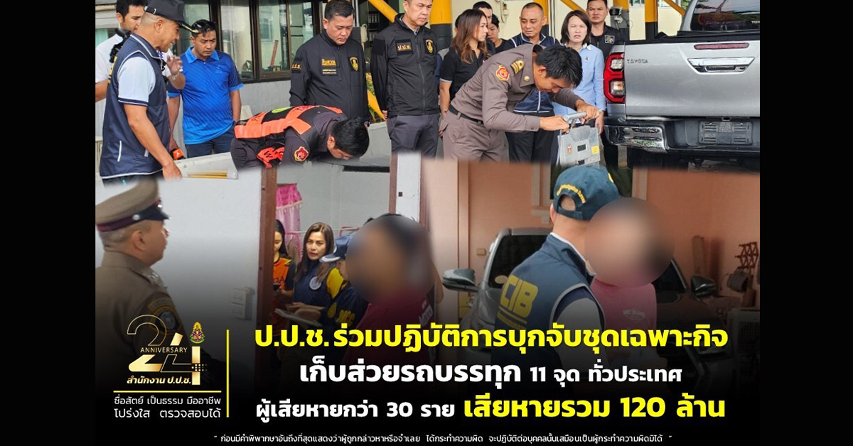 ป.ป.ช. 3 ก.ย.- ป.ป.ช. ร่วมปฏิบัติการบุกจับชุดเฉพาะกิจ เก็บส่วยรถบรรทุกในพื้นที่เป้าหมาย 11 จุดทั่วประเทศ พบผู้เสียหายกว่า 30 ราย มูลค่าเสียหายรวม 120 ล้านบาท