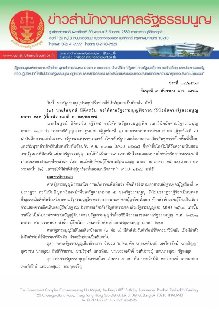 ที่ประชุมศาลรัฐธรรมนูญ มีมติเสียงข้างมาก 6 ต่อ 3 มีคำสั่งไม่รับคำร้องไว้พิจารณาวินิจฉัยในคดีที่นายไพบูลย์ นิติตะวัน รองหัวหน้าพรรคพลังประชารัฐ ขอให้ศาลรัฐธรรมนูญพิจารณาวินิจฉัยตามรัฐธรรมนูญมาตรา 213 ว่า กรมสนธิสัญญาและกฎหมาย และกระทรวงการต่างประเทศ นำบันทึกความเข้าใจระหว่างรัฐบาลแห่งราชอาณาจักรไทยกับรัฐบาลแห่งราชอาณาจักรกัมพูชา ว่าด้วยพื้นที่ที่ไทยและกัมพูชาอ้างสิทธิ์ในไหล่ทวีปทับซ้อนกัน ค.ศ. 2001 (MOU2544) เพิ่งทำขึ้นโดยไม่ได้รับความเห็นชอบจากรัฐสภา ที่ขัดหรือแย้งต่อรัฐธรรมนูญมาใช้ดำเนินการแบ่งเขตอธิปไตย และผลประโยชน์ทรัพยากรธรรมชาติทางทะเลของไทย ด้านอ่าวไทย ละเมิดสิทธิ์ของผู้ร้องตามรัฐธรรมนูญ มาตรา 3 มาตรา 25 และมาตรา 43 วรรคหนึ่ง(2) และขอให้มีคำสั่งให้ผู้ถูกร้องทั้งสองยกเลิกการนำ MOU 2544 มาใช้