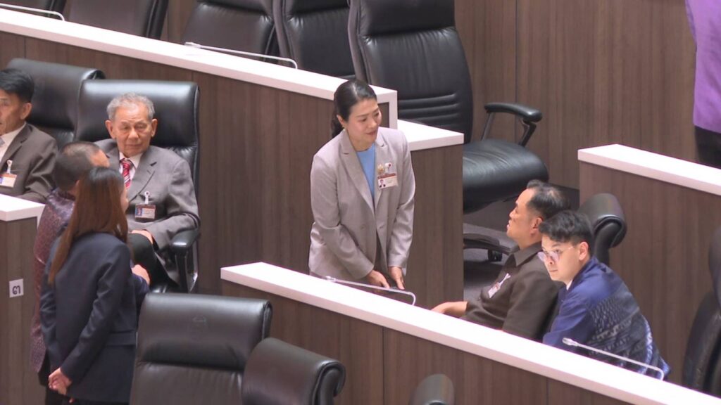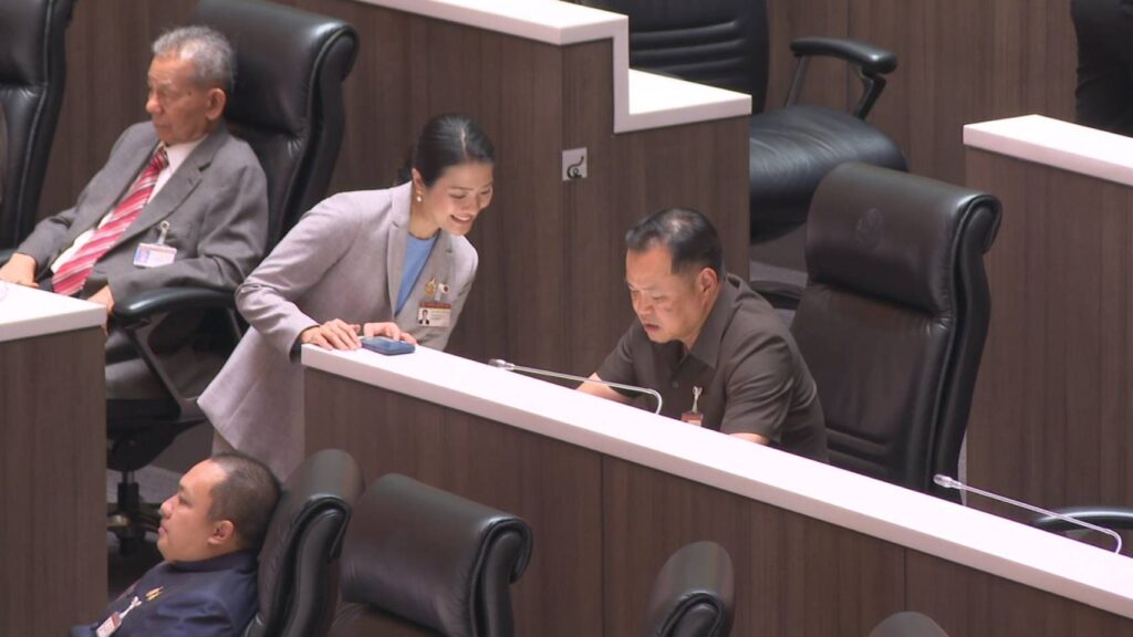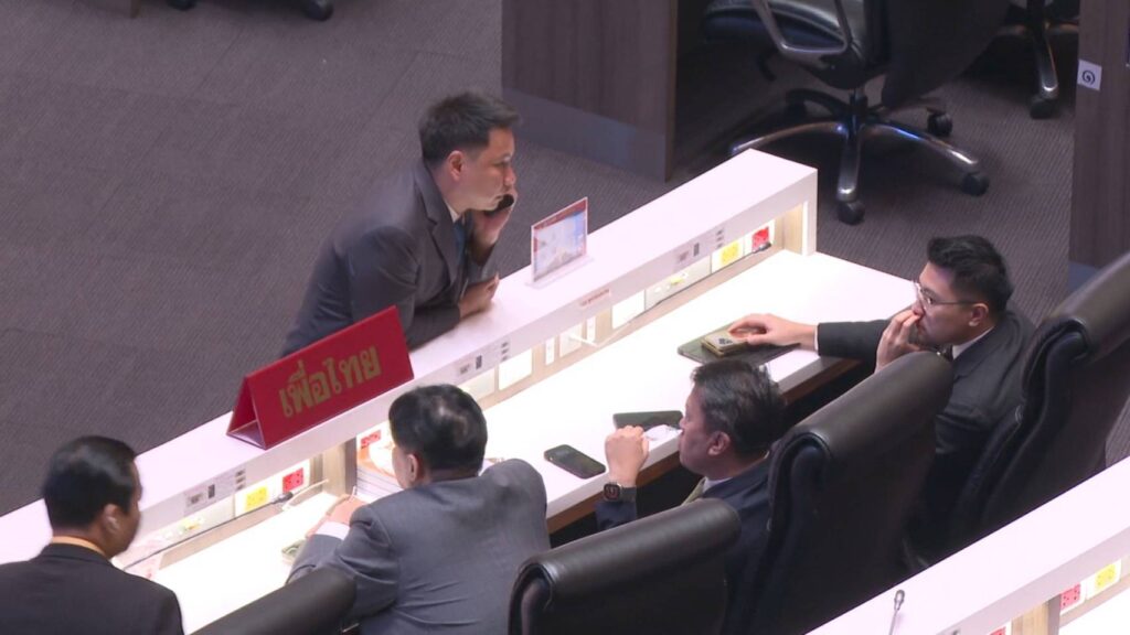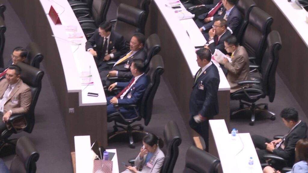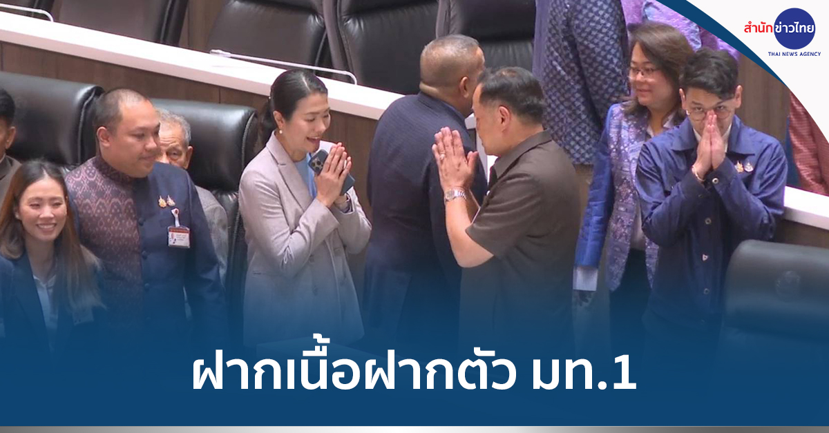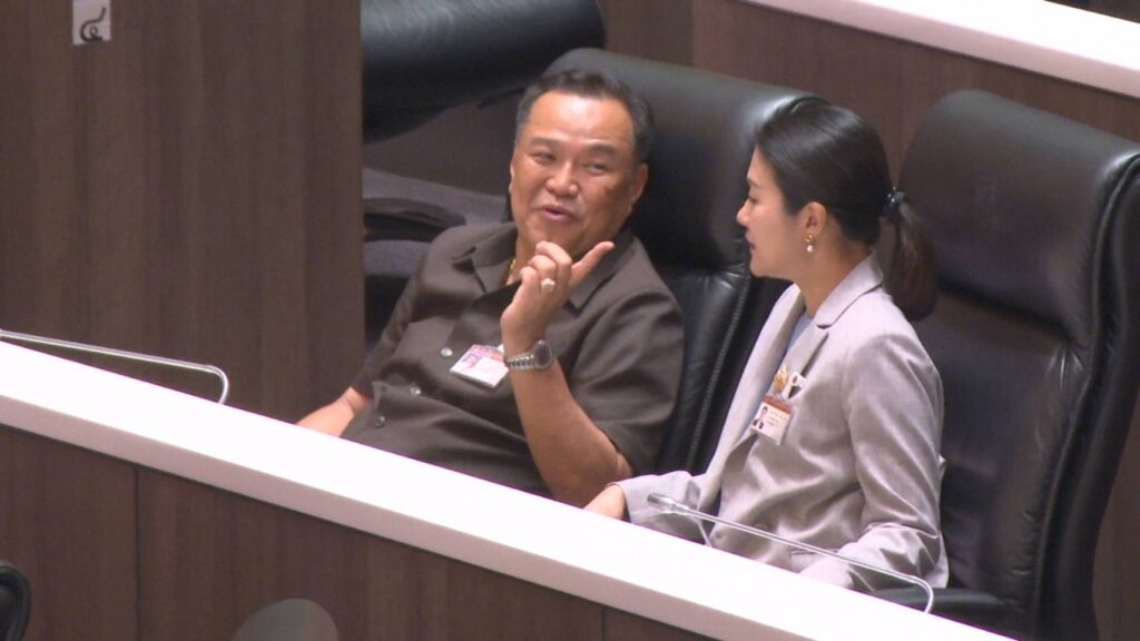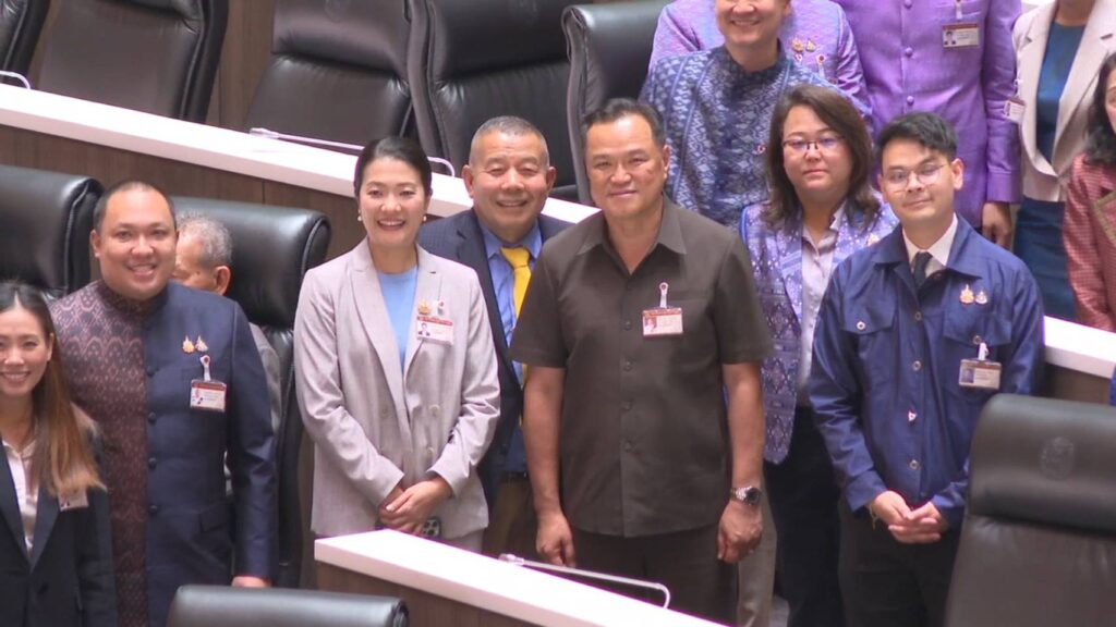 รัฐสภา 4 ก.ย. – มท.4 “ธีรรัตน์” ฝากเนื้อฝากตัว มท.1 “อนุทิน” ถึงที่นั่ง “ภูมิใจไทย” ก่อนชักภาพกลางสภา ขณะ “ธรรมนัส” พร้อมก๊วน พปชร. ยังปักหลักนั่งเก้าอี้ “เพื่อไทย”