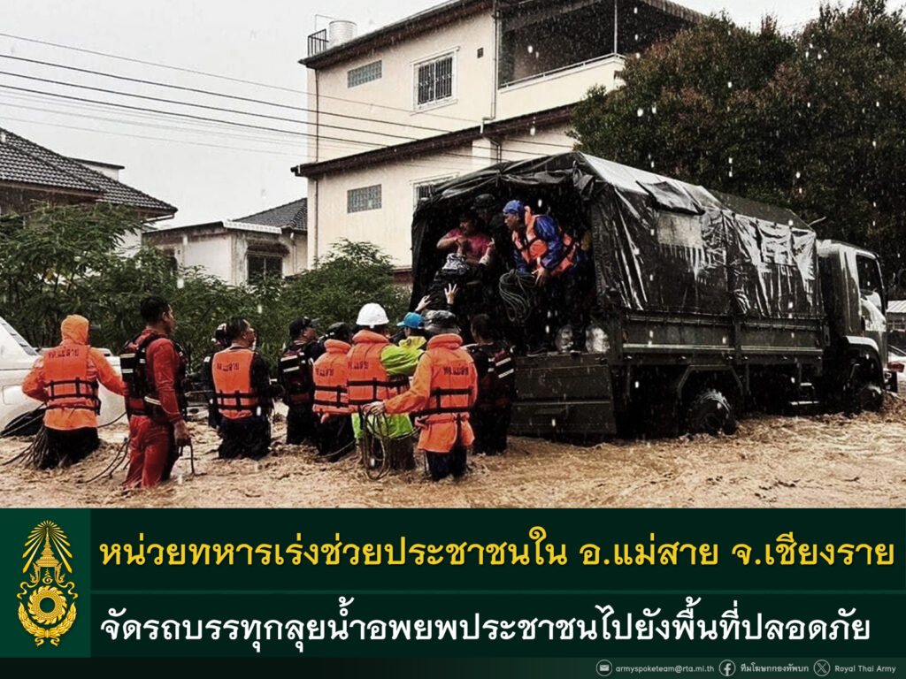 กองทัพบก 11 ก.ย. – หน่วยทหารเร่งช่วยประชาชนจากสถานการณ์น้ำป่าไหลหลากในพื้นที่แม่สาย จ.เชียงราย พร้อมติดตามสถานการณ์อุทกภัยในพื้นที่ภาคเหนืออย่างใกล้ชิด