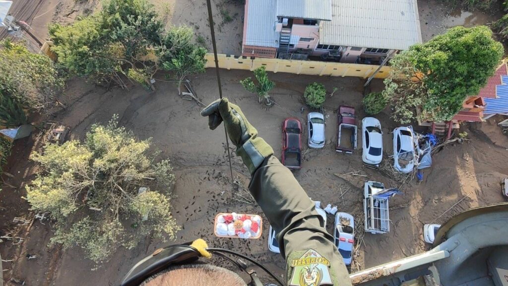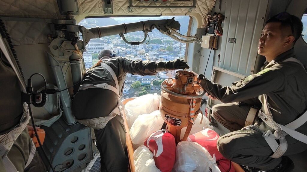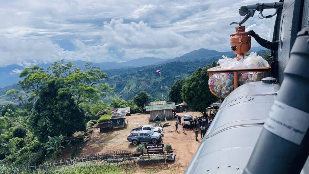 เชียงราย 14 ก.ย. – หน่วยบินเฉพาะกิจศูนย์การบินทหารบก จัดเฮลิคอปเตอร์ MI-17 ส่งเสบียงช่วยเหลือผู้ประสบอุทกภัยในพื้นที่ที่ถูกตัดขาดจากภายนอก อ.แม่ฟ้าหลวง จ.เชียงราย