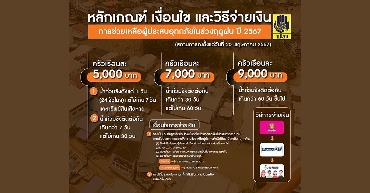 นายไชยวัฒน์ จุนถิระพงศ์ อธิบดีกรมป้องกันและบรรเทาสาธารณภัย (ปภ.) เปิดเผยว่า ตามที่คณะรัฐมนตรีได้เห็นชอบหลักเกณฑ์ เงื่อนไข และวิธีการจ่ายเงินช่วยเหลือผู้ประสบอุทกภัยในช่วงฤดูฝน ปี 2567 และมอบหมายให้กระทรวงมหาดไทย โดยกรมป้องกันและบรรเทาสาธารณภัย เป็นหน่วยรับงบประมาณและดำเนินการจ่ายเงินช่วยเหลือผู้ประสบภัยนั้น เพื่อให้การจ่ายเงินช่วยเหลือผู้ประสบภัยเป็นไปอย่างถูกต้อง ประชาชนผู้ประสบอุทกภัยได้รับเงินช่วยเหลือโดยเร็ว กรมป้องกันและบรรเทาสาธารณภัยจึงได้เตรียมจัดประชุมกับ 57 จังหวัดที่ได้รับการจัดสรรเงินช่วยเหลือผู้ประสบภัยในช่วงฤดูฝน ปี 2567 เพื่อชี้แจงขั้นตอนและแนวทางการปฏิบัติงานให้แก่ผู้ว่าราชการจังหวัด หัวหน้าสำนักงานป้องกันและบรรเทาสาธารณภัยจังหวัด นายอำเภอ กำนัน ผู้ใหญ่บ้าน ผู้บริหารองค์กรปกครองส่วนท้องถิ่น และผู้มีส่วนเกี่ยวข้อง โดยมีกำหนดจัดประชุมชี้แจงในวันที่ 24 กันยายน 2567 เวลา 13.30 น.