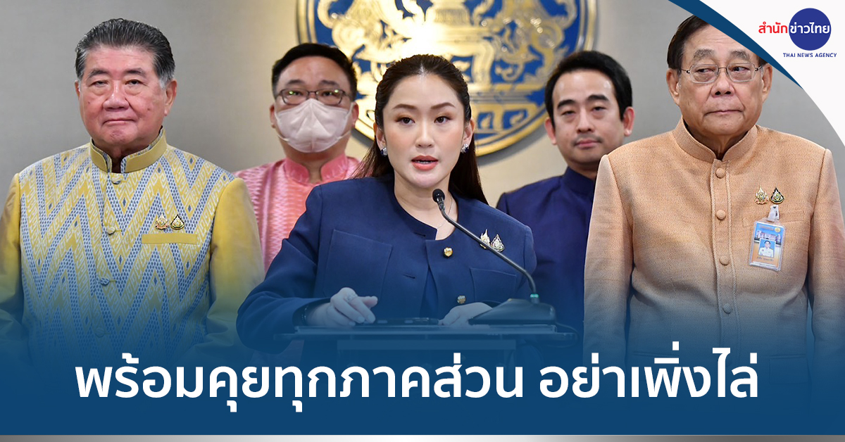 เมื่อถามว่า พร้อมคุยใช่หรือไม่ น.ส.แพทองธาร กล่าวว่า อ๋อพร้อมอยู่แล้วค่ะ วันนี้เราเป็นรัฐบาล เป็นตำแหน่งนายกรัฐมนตรี เพราะฉะนั้นเราก็ต้องพูดคุยกับทุกภาคส่วนอยู่แล้ว และอีกอย่างหนึ่งคือการทำให้ประเทศชาติสงบสุขเป็นสิ่งสำคัญ ถ้าประเทศสงบสุขคนไทยมีความสุข ต่างประเทศก็จะมาลงทุนด้วย ฉะนั้นอันนี้ก็สำคัญ