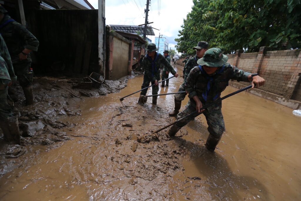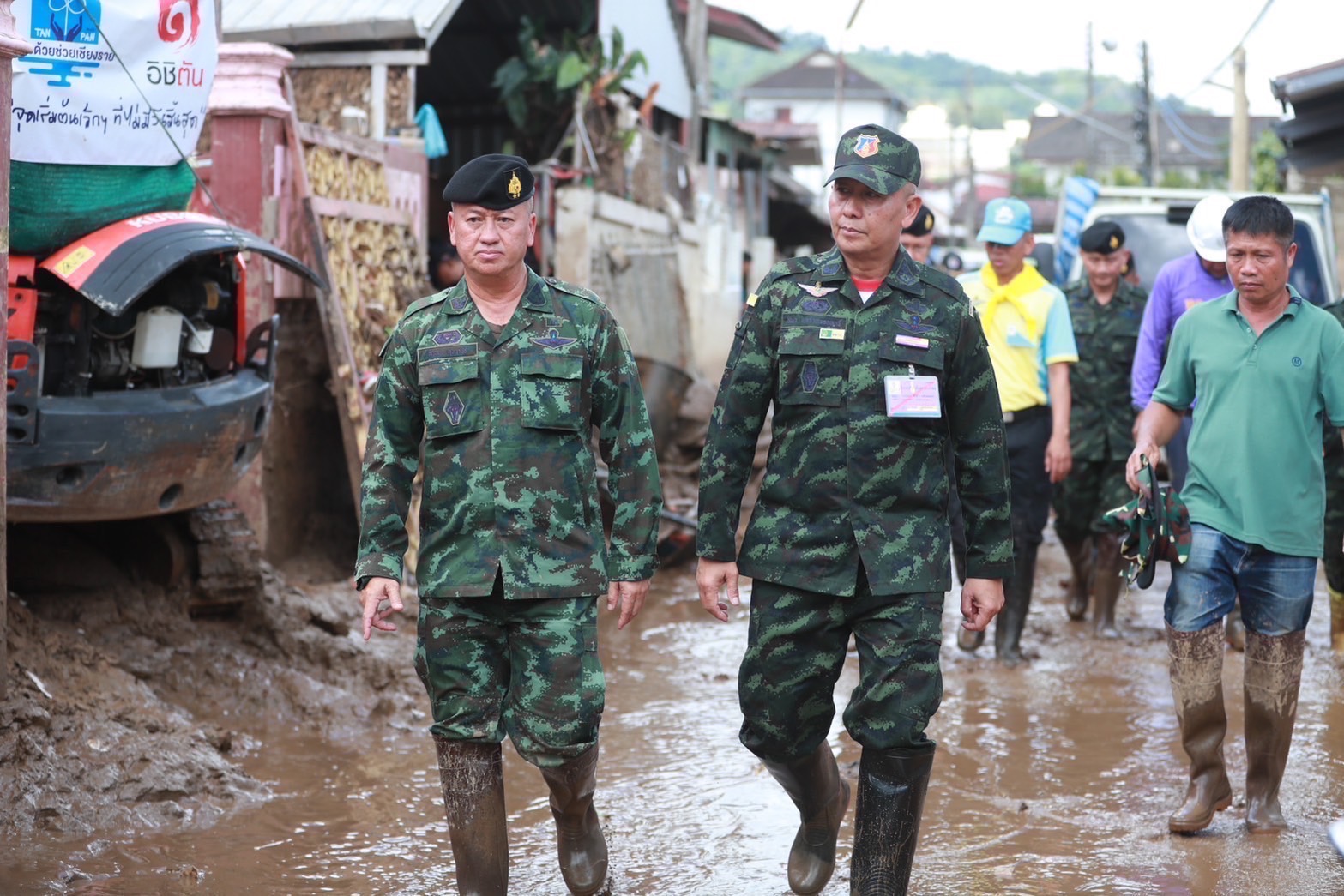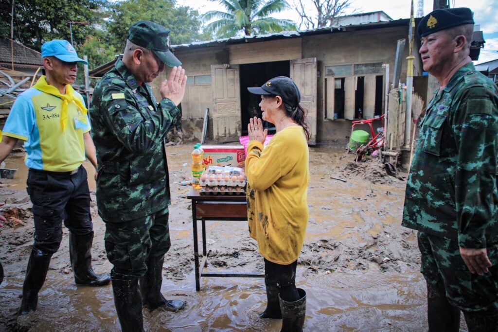 และปัจจุบัน ตามที่รัฐบาลได้จัดตั้งศูนย์ปฏิบัติการช่วยเหลือผู้ประสบอุทกภัย วาตภัย และดินโคลนถล่ม (ศปช.) ปฎิบัติการส่วนหน้า หรือ ศปช.ส่วนหน้า เพื่อเป็นศูนย์สั่งการและบูรณาการร่วมของภาคส่วนต่างๆ ในการคลี่คลายสถานการณ์นั้น กองทัพบกได้จัดตั้งศูนย์บรรเทาสาธารณภัยส่วนหน้า ร่วมติดตามการทำงานและประสานการปฏิบัติดังกล่าว โดยนำศักยภาพของกำลังพล เครื่องมือและยุทโธปกรณ์ของหน่วยทหาร โดยเฉพาะชุดช่าง ร่วมกับศูนย์อำนวยการใหญ่จิตอาสาพระราชทาน, ศูนย์อำนวยการจิตอาสาพระราชทานภาค 3 และหน่วยงานราชการต่างๆ เข้าบรรเทาปัญหาความเดือดร้อนและฟื้นฟูพื้นที่ให้ประชาชน ตามที่ได้รับการแบ่งมอบพื้นที่จากทาง ศปช.ส่วนหน้า ทั้งการเร่งฟื้นฟูระบบจ่ายน้ำประปา และนำชุดประปาสนามออกบริการแจกจ่ายน้ำให้ประชาชนที่ได้รับผลกระทบ รวม 3 แห่ง ซึ่งปัจจุบันจะยังคงดำเนินการอย่างต่อเนื่องจนกว่าระบบประปาในพื้นที่สามารถกลับมาใช้งานได้ตามปกติ, การฟื้นฟูบ้านเรือนประชาชน โดยเฉพาะกลุ่มเปราะบางและผู้สูงอายุ รวม 48 หลัง ดำเนินการเสร็จสิ้น 100% รวมทั้งการช่วยเหลือฟื้นฟูบ้านพักอาศัยที่เจ้าของบ้านสามารถช่วยเหลือตนเองได้ จำนวน 6,980 หลัง เสร็จแล้ว 6,289 หลัง คงเหลือ 691 หลัง ตลอดจนการฟื้นคืนแหล่งชุมชน อาคารสถานที่ และเส้นทางสัญจรต่างๆ ทั้งสายหลักและสายรอง 24 เส้นทาง ระยะทาง 10.15 กิโลเมตร