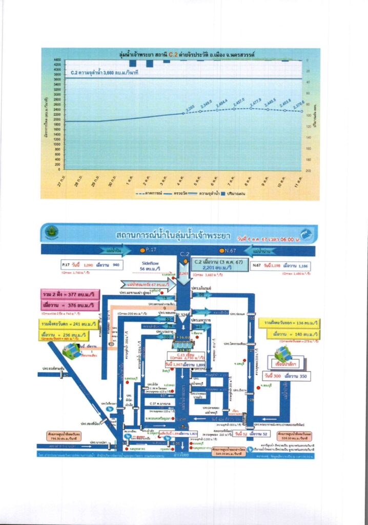 นายไชยวัฒน์ จุนถิระพงศ์ อธิบดีกรมป้องกันและบรรเทาสาธารณภัย (ปภ.) เปิดเผยว่า กรมป้องกันและบรรเทาสาธารณภัย (ปภ.) ในฐานะกองอำนวยการป้องกันและบรรเทาสาธารณภัยกลาง (กอปภ.ก.) ได้รับแจ้งจากกรมชลประทาน ว่า ประเทศไทยตอนบนมีลักษณะอากาศแปรปรวน โดยมีฝนฟ้าคะนอง ลมกระโชกแรง ฝนตกหนักมากบางพื้นที่บริเวณภาคเหนือ ภาคกลาง รวมถึงกรุงเทพมหานครและปริมณฑล โดยปัจจุบันปริมาณน้ำไหลผ่านเขื่อนเจ้าพระยามีปริมาณ 2,000 ลูกบาศก์เมตรต่อวินาที และจากการคาดการณ์ปริมาณน้ำล่วงหน้า 1 – 7 วันข้างหน้า คาดว่าในวันที่ 11 ตุลาคม 2567 ที่สถานี C.2 อำเภอเมืองนครสวรรค์ จังหวัดนครสวรรค์ มีปริมาณน้ำไหลผ่าน ประมาณ 2,200 – 2,500 ลูกบาศก์เมตรต่อวินาที และคาดการณ์ปริมาณน้ำ Sideflow ประมาณ 200 ลูกบาศก์เมตรต่อวินาที ร่วมกับคาดการณ์ปริมาณน้ำจากแม่น้ำสะแกกรัง ประมาณ 100 ลูกบาศก์เมตรต่อวินาที ซึ่งทำให้ปริมาณน้ำที่เหนือเขื่อนเจ้าพระยา มีปริมาณ 2,800 ลูกบาศก์เมตรต่อวินาที และรับน้ำเข้าระบบกรมชลประทาน ทั้ง 2 ฝั่ง ในอัตรา 400 ลูกบาศก์เมตรต่อวินาที จึงมีความจำเป็นต้องระบายน้ำผ่านท้ายเขื่อนเจ้าพระยา ในอัตราไม่เกิน 2,400 ลูกบาศก์เมตรต่อวินาที โดยจะมีการระบายเพิ่มขึ้นแบบขั้นบันได ซึ่งส่งผลให้พื้นที่ริมน้ำมีระดับน้ำเพิ่มสูงขึ้นจากปัจจุบันอีกประมาณ 0.60 – 0.70 เมตร ทำให้พื้นที่ลุ่มต่ำนอกคันกั้นน้ำบริเวณคลองโผงเผง จังหวัดอ่างทอง คลองบางบาล จังหวัดพระนครศรีอยุธยา และตำบลหัวเวียง อำเภอเสนา ตำบลลาดชิด ตำบลท่าดินแดง อำเภอผักไห่ จังหวัดพระนครศรีอยุธยา (แม่น้ำน้อย) วัดสิงห์ อำเภออินทร์บุรี จังหวัดสิงห์บุรี อำเภอเมืองสิงห์บุรี อำเภอพรหมบุรี จังหวัดสิงห์บุรี วัดไชโย อำเภอไชโย จังหวัดอ่างทอง ตำบลโพนางดำ อำเภอสรรพยา จังหวัดชัยนาท วัดเสือข้าม อำเภออินทร์บุรี จังหวัดสิงห์บุรี และอำเภอป่าโมก จังหวัดอ่างทอง อาจส่งผลกระทบต่อพื้นที่ชุมชน ตั้งแต่วันที่ 6 ตุลาคม 2567 เป็นต้นไป