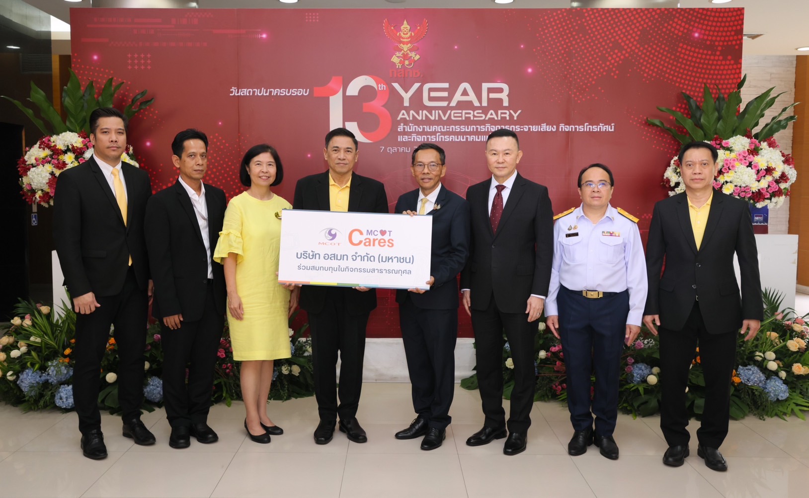 นายผาติยุทธ ใจสว่าง รักษาการในตำแหน่งผู้อำนวยการใหญ่ บมจ.อสมท พร้อมคณะผู้บริหาร ร่วมแสดงความยินดีกับสำนักงานคณะกรรมการกิจการกระจายเสียง กิจการโทรทัศน์และกิจการโทรคมนาคมแห่งชาติ หรือ กสทช. เนื่องในโอกาสวันสถาปนา ครบรอบ 13 ปี และได้ร่วมบริจาคเงินเพื่อการกุศลให้แก่สภากาชาดไทย โดยมีพลอากาศโท ดร.ธนพันธุ์ หร่ายเจริญ กรรมการ กสทช. เป็นผู้รับมอบ