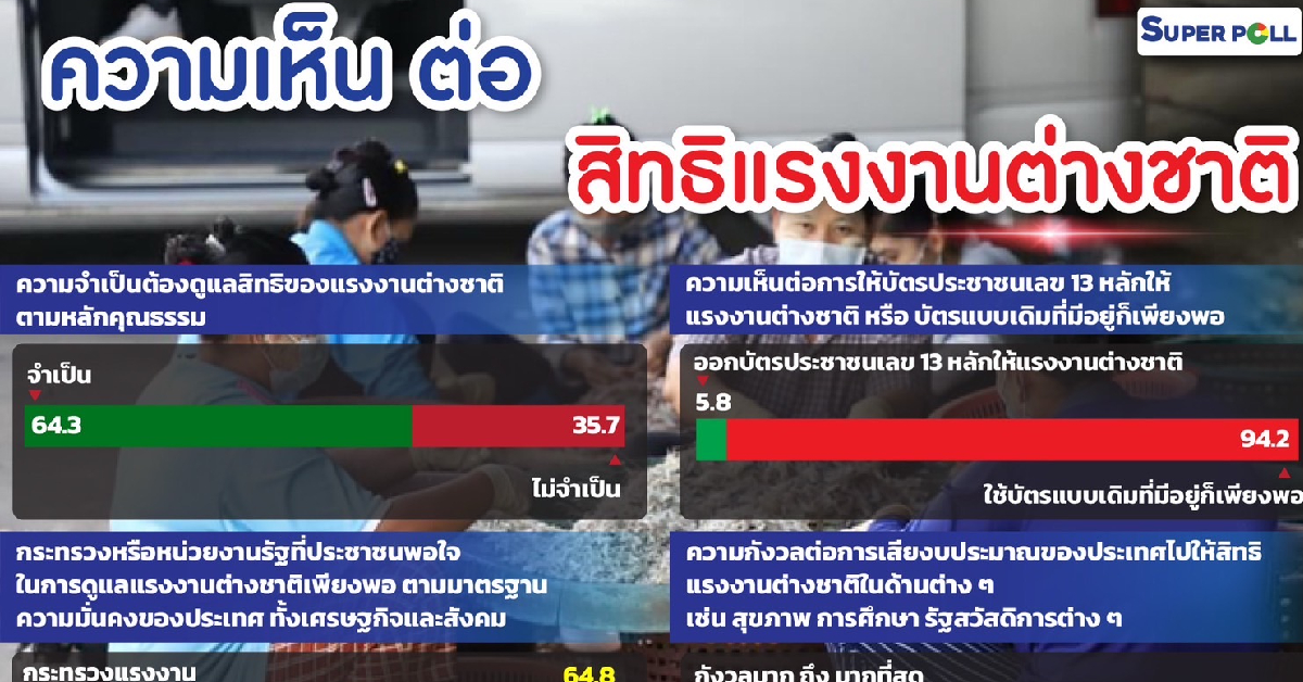ผลสำรวจจากสำนักวิจัยซูเปอร์โพลเกี่ยวกับความเห็นของประชาชนต่อสิทธิแรงงานต่างชาติในประเทศไทย ได้เปิดเผยถึงทัศนะที่หลากหลายจากผู้ตอบแบบสอบถามพอสรุปได้ดังนี้