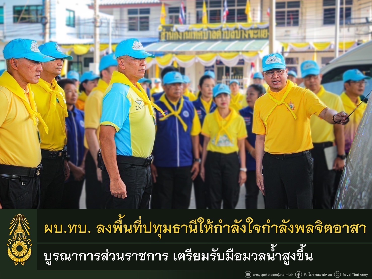 พล.อ.พนา แคล้วปลอดทุกข์ ผู้บัญชาการทหารบก ในฐานะผู้อำนวยการศูนย์ประสานงานโครงการจิตอาสาพระราชทานกองทัพบก เดินทางลงพื้นที่ติดตามสถานการณ์น้ำและความคืบหน้าในการเตรียมการช่วยเหลือประชาชน จากสถานการณ์อุทกภัย ณ เทศบาลตำบลบางขะแยง อ.เมืองปทุมธานี จ.ปทุมธานี ซึ่งเป็นหนึ่งในจุดที่มีความเสี่ยง เนื่องจากมีพื้นที่ส่วนใหญ่ติดกับแม่น้ำเจ้าพระยา และอาจได้รับผลกระทบเมื่อระดับน้ำสูงขึ้น โดยผู้บัญชาการทหารบกได้รับฟังการบรรยายสรุปสถานการณ์อุทกภัยและการเตรียมการช่วยเหลือประชาชนจากมณฑลทหารบกที่ 11 ซึ่งรับผิดชอบพื้นที่เสี่ยง รวม 7 จุด และกองพันทหารสื่อสารที่ 13 กองพลทหารปืนใหญ่ต่อสู้อากาศยาน ซึ่งรับผิดชอบพื้นที่ 14 ตำบล ใน อ.เมืองปทุมธานี จ.ปทุมธานี จากนั้นได้เยี่ยมให้กำลังใจและมอบน้ำดื่มให้กับกำลังพลจิตอาสาและประชาชนจิตอาสาที่ได้ร่วมกันกรอกกระสอบทราย ภายในอาคารโดมอเนกประสงค์ เทศบาลตำบลบางขะแยง เพื่อเตรียมนำไปวางเป็นแนวกั้นน้ำบริเวณรอบจุดเสี่ยงในพื้นที่