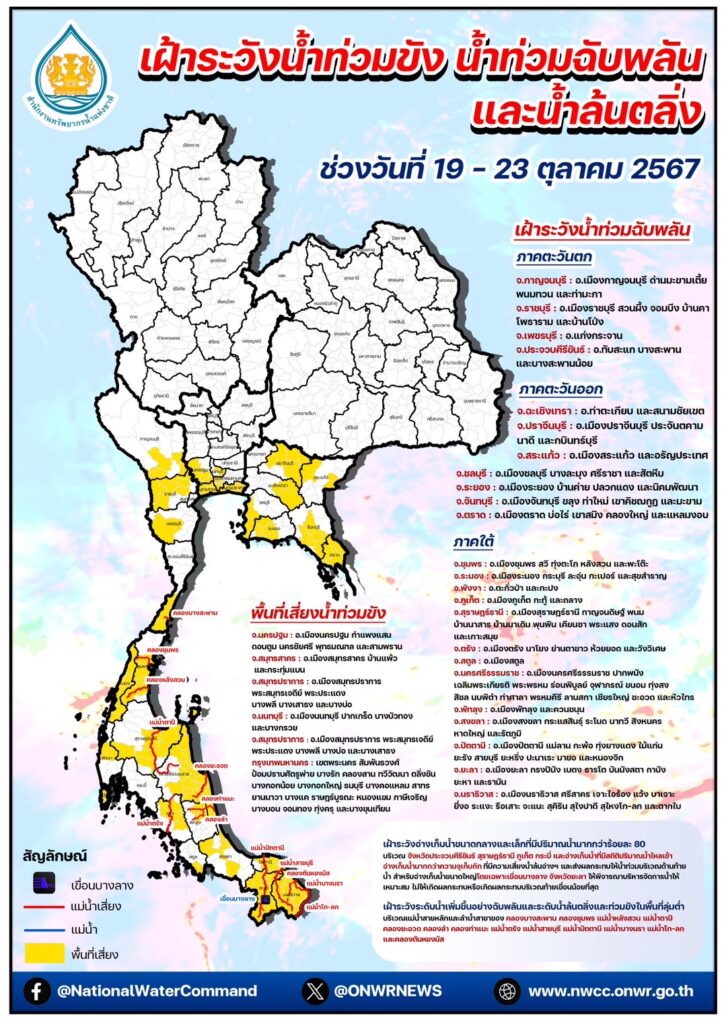 นายจิรายุ กล่าวว่าตามที่ สำนักงานทรัพยากรน้ำแห่งชาติ (สทนช.) ได้ออกประกาศแจ้งพื้นที่ 29 จังหวัดตั้งแต่ภาคกลาง ภาคตะวันตก ภาคตะวันออก และภาคใต้ เฝ้าระวังน้ำท่วมขัง น้ำท่วมฉับพลัน และน้ำล้นตลิ่ง ในช่วงวันที่ 19-23 ต.ค.67 ดังนี้ ภาคกลาง 5 จังหวัด ได้แก่ นครปฐม สมุทรสาคร นนทบุรี สมุทรปราการ กรุงเทพมหานคร