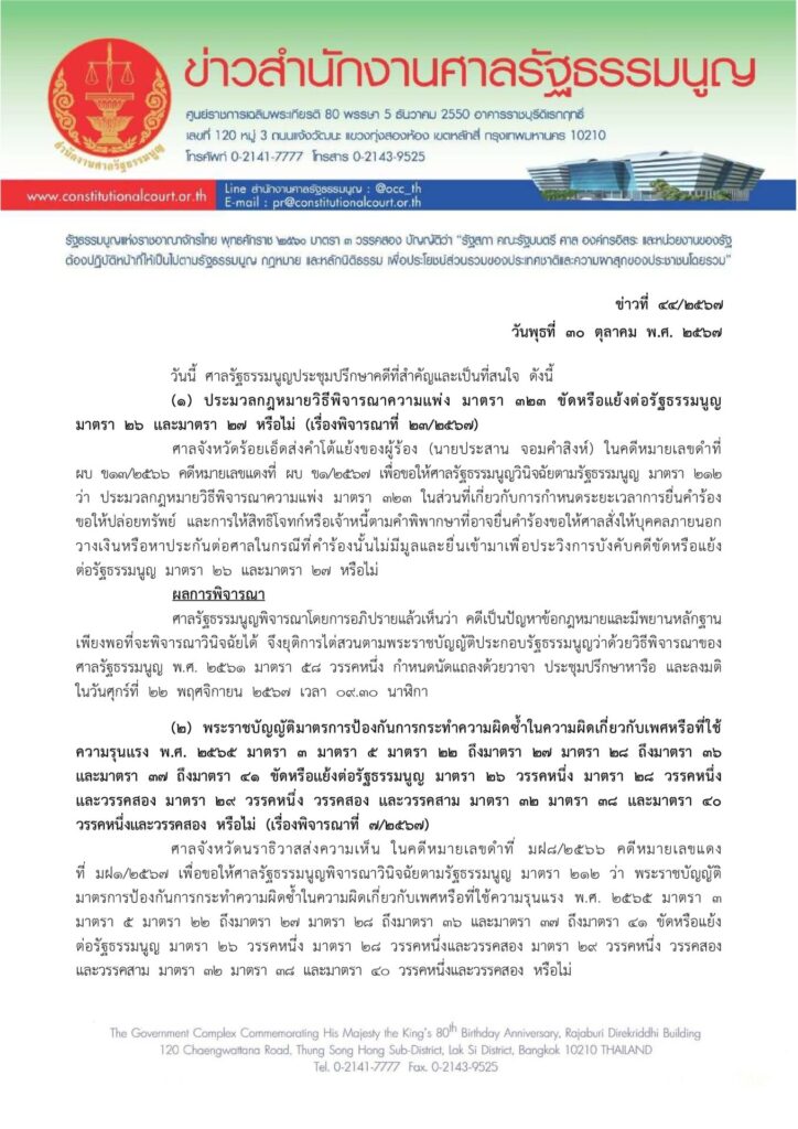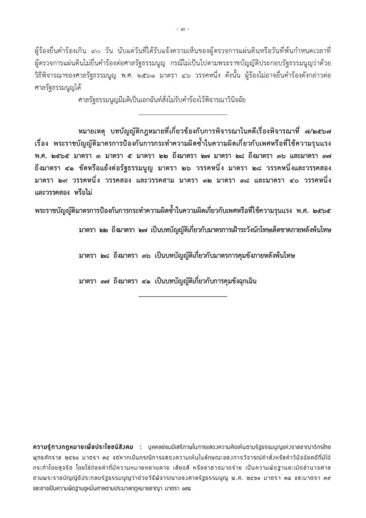 ศาลพิจารณาแล้วเห็นว่า ข้อเท็จจริงตามคำร้องและเอกสาร ประกอบคำร้อง ผู้ร้องกล่าวอ้างว่า การกระทำขององค์คณะผู้พิพากษาศาลแขวงดุสิตและองค์คณะผู้พิพากษา ศาลฎีกา ในการพิจารณาและพิพากษาคดีอาญาขัดหรือแย้งต่อรัฐธรรมนูญ มาตรา 3 มาตรา 28 วรรคสาม และมาตรา 188 ประมวลกฎหมายอาญา มาตรา90 และประมวลกฎหมายวิธีพิจารณาความอาญา มาตรา 39 (4) และมาตรา 185 วรรคหนึ่ง เมื่อข้อเท็จจริงตามคำร้องและเอกสารประกอบคำร้องปรากฏว่า ผู้ร้องยื่นคำร้องเกิน 90 วัน นับแต่วันที่ได้รับแจ้งความเห็นของผู้ตรวจการแผ่นดิน หรือวันที่พ้นกำหนดเวลาที่ ผู้ตรวจการแผ่นดินไม่ยื่นคำร้องต่อศาลรัฐธรรมนูญ กรณีไม่เป็นไปตาม พ.ร.ป.ว่าด้วยวิธีพิจารณาของศาลรัฐธรรมนูญ พ.ศ. 2561 มาตรา 46 วรรคหนึ่ง ดังนั้น ผู้ร้องไม่อาจยื่นคำร้องดังกล่าวต่อศาลรัฐธรรมนูญได้ .314.-สำนักข่าวไทย