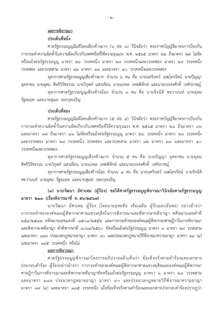 ศาลรัฐธรรมนูญประชุมปรึกษาคดีที่สำคัญ และเป็นที่สนใจ และมีมติเป็นเอกฉันท์ไม่รับคำร้องไว้พิจารณาวินิจฉัย ในคดีที่ นายวัฒนา อัศวเหม อดีตรัฐมนตรีช่วยว่าการกระทรวงมหาดไทย ผู้ร้อง (โดยนายยุทธชัย เข็มเฉลิม ผู้รับมอบฉันทะ) กล่าวอ้างว่า การกระทำขององค์คณะผู้พิพากษาศาลแขวงดุสิตในการพิจารณาและพิพากษาคดีอาญา คดีหมายเลขดำที่ 254/2547คดีหมายเลขแดงที่ 3501/2552 และการกระทำขององค์คณะผู้พิพากษาศาลฎีกาในการพิจารณาและพิพากษาคดีอาญา คำพิพากษาที่ 8064/2560 ขัดหรือแย้งต่อรัฐธรรมนูญ มาตรา 3 มาตรา 28 วรรคสาม และมาตรา 188 ประมวลกฎหมายอาญา มาตรา 90 และประมวลกฎหมายวิธีพิจารณาความอาญา มาตรา 139(4) และมาตรา 185 วรรคหนึ่ง หรือไม่