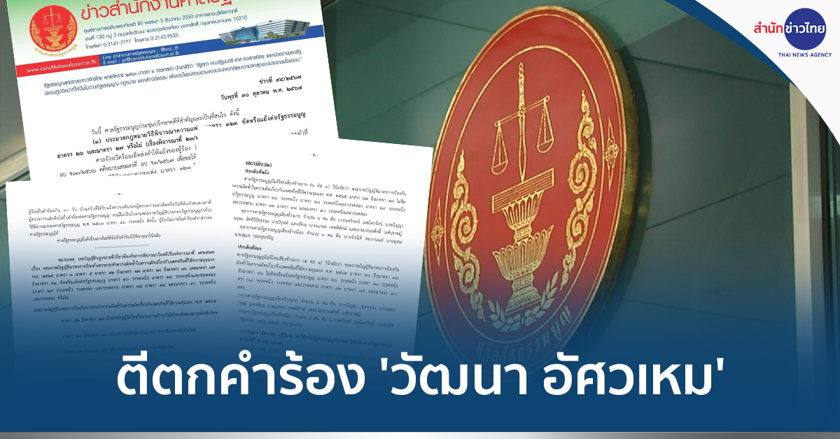 ศาลรัฐธรรมนูญ 30 ต.ค.- ศาลรัฐธรรมนูญไม่รับคำร้อง “วัฒนา อัศวเหม” ขอวินิจฉัยองค์คณะผู้พิพากษาคดีทุจริตจัดซื้อที่ดินบ่อบำบัดน้ำเสียคลองด่านตัดสินไม่ชอบ