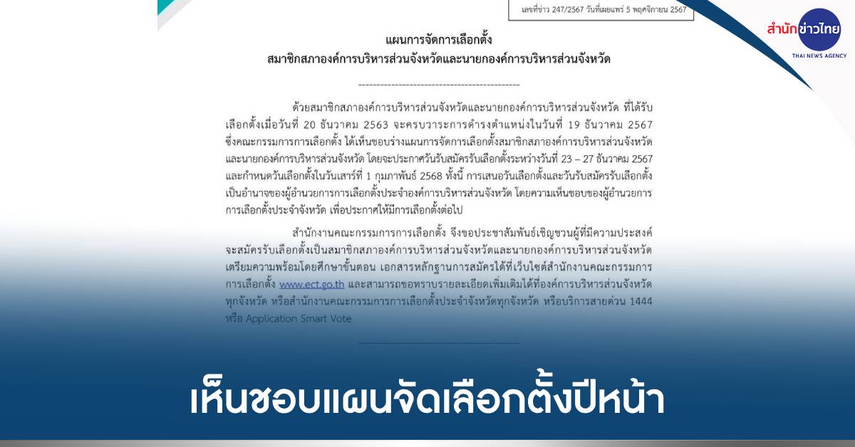 กกต. 5 พ.ย.-กกต.เห็นชอบแผนจัดเลือกตั้งสมาชิกและนายก อบจ. 1 ก.พ.ปีหน้า เปิดรับสมัคร 23-27 ธ.ค.นี้ มี 29 จังหวัดไม่ต้องเลือก เหตุลาออกก่อนครบวาระและทยอยจัดเลือกตั้งใหม่แล้ว