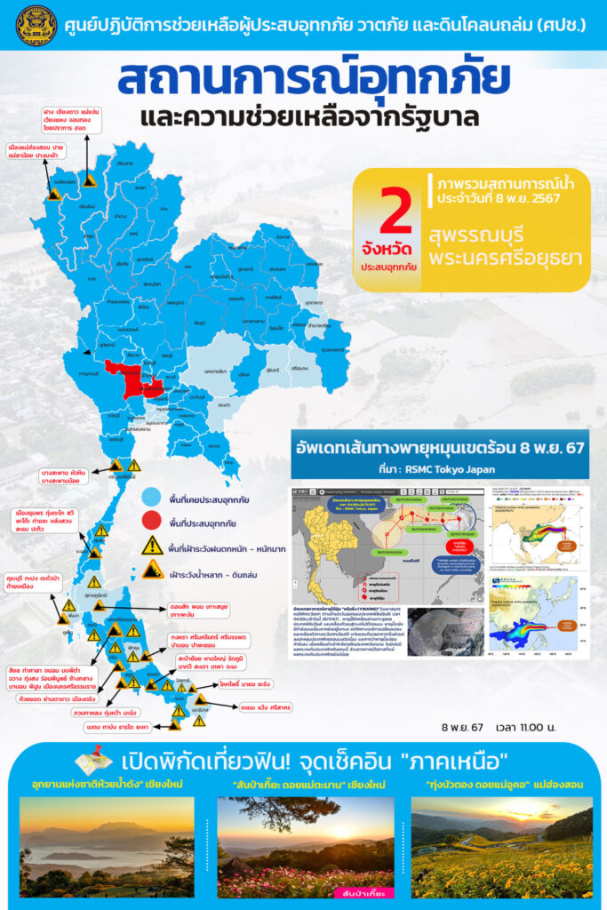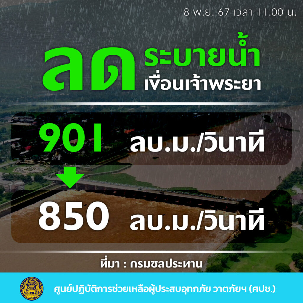นายจิรายุ ห่วงทรัพย์ ที่ปรึกษาของนายกรัฐมนตรีและโฆษกศูนย์ปฏิบัติการช่วยเหลือผู้ประสบอุทกภัย วาตภัย และดินโคลนถล่ม หรือ ศปช. เปิดเผยว่า ศปช.ยังคงติดตาม การบริหารจัดการน้ำของหน่วยงานที่เกี่ยวข้องอย่างต่อเนื่องและเหมาะสม เพื่อให้มีน้ำเพียงพอในช่วงหน้าแล้ง ประกอบกับได้ผันน้ำออกทางฝั่งตะวันตกและตะวันออกเพื่อสนับสนุนพื้นที่การเกษตร ทำให้ขณะนี้ได้ทยอยปรับลดการระบายน้ำอย่างต่อเนื่องที่เขื่อนเจ้าพระยา ล่าสุดปรับลดการระบายน้ำเหลือ 850 ลบ.ม./วินาที โดยกรมชลประทานยืนยันจะปรับลดเหลือระดับต่ำกว่า 700 ลบ.ม./วินาทีได้ภายใน 3 วัน