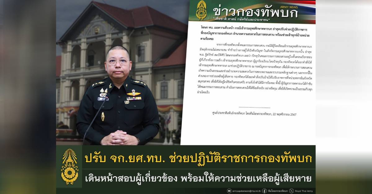 กองทัพบก 22 พ.ย.-ย้ายเจ้ากรมยุทธศึกษาทหารบก ช่วยปฏิบัติราชการที่กองบัญชาการกองทัพบก หลังถูกร้องทำร้ายร่างกายผู้ใต้บังคับบัญชา พร้อมช่วยเจ้าทุกข์ย้ายหน่วยตามร้องขอ
