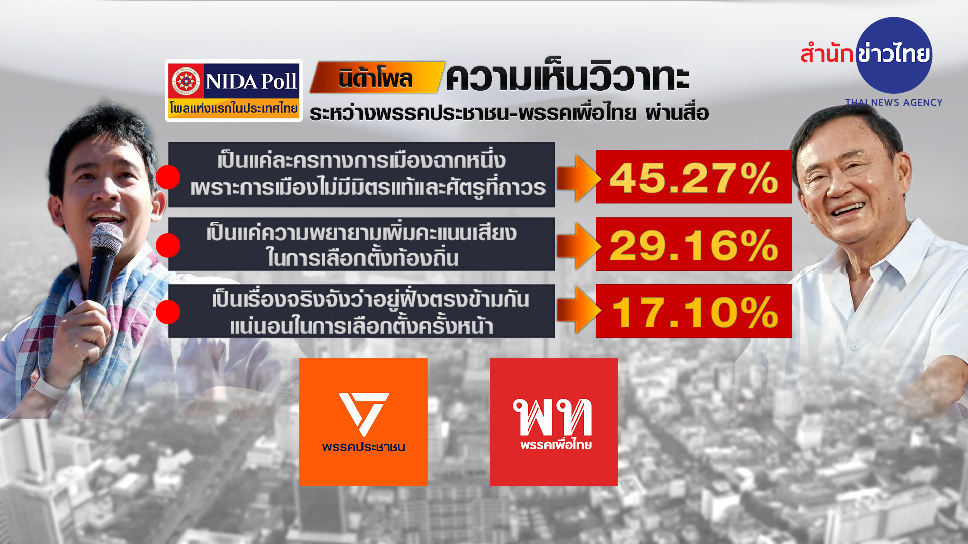 เมื่อถามประชาชนถึงความคิดเห็นเกี่ยวกับการวิวาทะระหว่างพรรคประชาชนและพรรคเพื่อไทยที่ผ่านสื่อในขณะนี้ พบว่า ร้อยละ 45.27 ระบุว่า เป็นแค่ละครทางการเมืองฉากหนึ่ง เพราะการเมืองไม่มีมิตรแท้และศัตรูที่ถาวร ร้อยละ 29.16 ระบุว่า เป็นแค่ความพยายามที่จะเพิ่มคะแนนเสียงในการเลือกตั้งท้องถิ่น ร้อยละ 17.10 ระบุว่า เป็นเรื่องจริงจังว่าอยู่ฝั่งตรงข้ามกันแน่นอนในการเลือกตั้งครั้งหน้า
