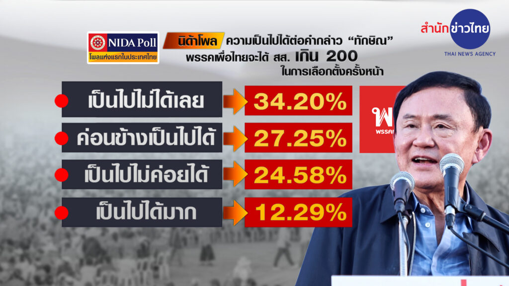 สำหรับความเป็นไปได้ต่อคำกล่าวของอดีตนายกรัฐมนตรีทักษิณ ชินวัตร ว่า พรรคเพื่อไทยจะได้ สส. เกิน 200 ที่นั่งในการเลือกตั้งครั้งหน้า พบว่า ร้อยละ 34.20 ระบุว่า เป็นไปไม่ได้เลย ร้อยละ 27.25 ระบุว่า ค่อนข้างเป็นไปได้ ร้อยละ 24.58 ระบุว่า เป็นไปไม่ค่อยได้ ร้อยละ 12.29 ระบุว่า เป็นไปได้มาก