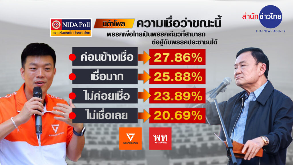 ด้านความเชื่อที่ว่าขณะนี้พรรคเพื่อไทยเป็นพรรคเดียวที่สามารถต่อสู้กับพรรคประชาชนได้ พบว่า ร้อยละ 27.86 ระบุว่า ค่อนข้างเชื่อ ร้อยละ 25.88 ระบุว่า เชื่อมาก ร้อยละ 23.89 ระบุว่า ไม่ค่อยเชื่อ ร้อยละ 20.69 ระบุว่า ไม่เชื่อเลย