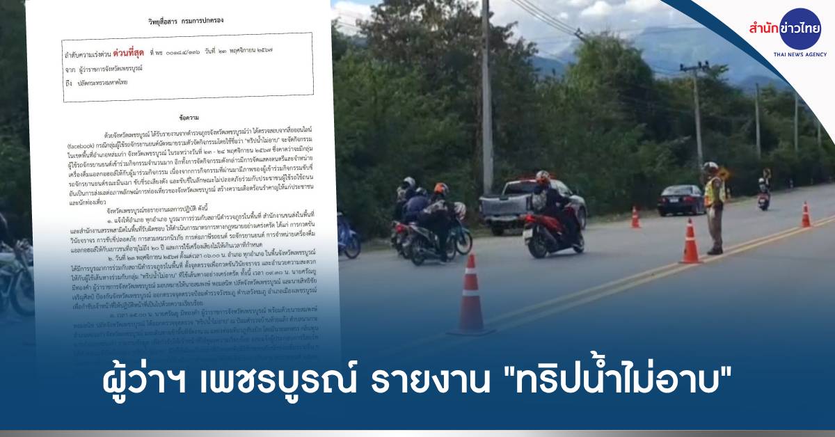 กทม. 25 พ.ย.-ผู้ว่าฯ เพชรบูรณ์ ทำหนังสือถึงปลัดมหาดไทย รายงานผลจับกุมดำเนินคดี-ตักเตือน “ทริปน้ำไม่อาบ” พบผิด วินัยจราจร-ยาเสพติดอื้อ