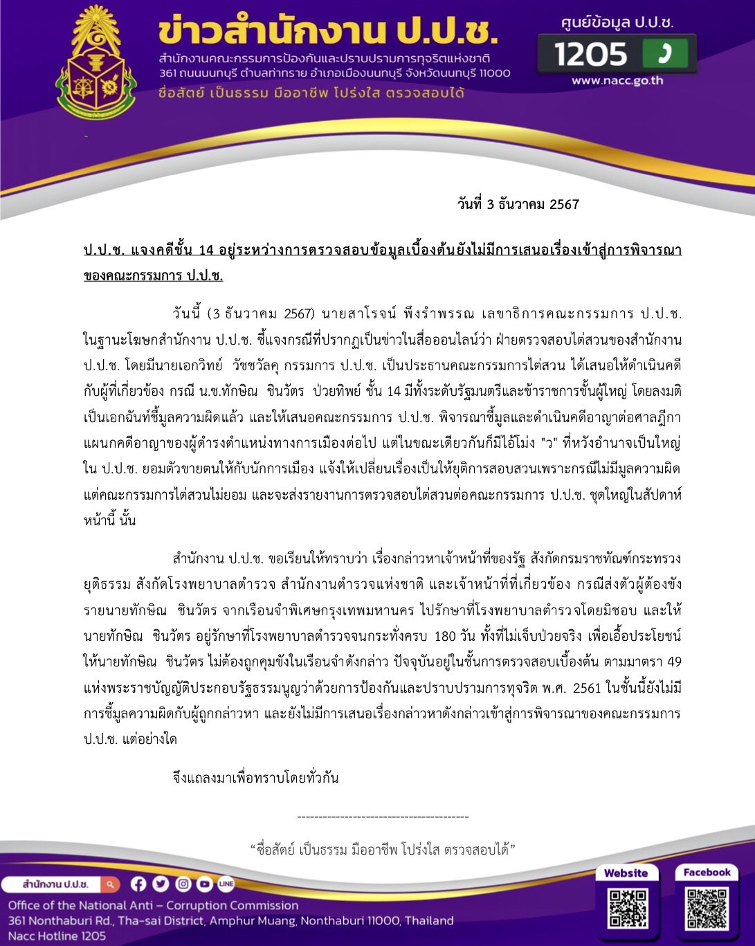 สำนักงาน ป.ป.ช. ขอเรียนให้ทราบว่า เรื่องกล่าวหาเจ้าหน้าที่ของรัฐ สังกัดกรมราชทัณฑ์กระทรวง ยุติธรรม สังกัดโรงพยาบาลตำรวจ สำนักงานตำรวจแห่งชาติ และเจ้าหน้าที่ที่เกี่ยวข้อง กรณีส่งตัวผู้ต้องขัง รายนายทักษิณ ชินวัตร จากเรือนจำพิเศษกรุงเทพมหานคร ไปรักษาที่โรงพยาบาลตำรวจโดยมิชอบ และให้ นายทักษิณ ชินวัตร อยู่รักษาที่โรงพยาบาลตำรวจจนกระทั่งครบ 180 วัน ทั้งที่ไม่เจ็บป่วยจริง เพื่อเอื้อประโยชน์ ให้นายทักษิณ ชินวัตร ไม่ต้องถูกคุมขังในเรือนจำดังกล่าว ปัจจุบันอยู่ในชั้นการตรวจสอบเบื้องต้น ตามมาตรา 49 แห่งพระราชบัญญัติประกอบรัฐธรรมนูญว่าด้วยการป้องกันและปราบปรามการทุจริต พ.ศ. 2561 ในชั้นนี้ยังไม่มี การชี้มูลความผิดกับผู้ถูกกล่าวหา และยังไม่มีการเสนอเรื่องกล่าวหาดังกล่าวเข้าสู่การพิจารณาของคณะกรรมการ ป.ป.ช. แต่อย่างใด.-314-สำนักข่าวไทย