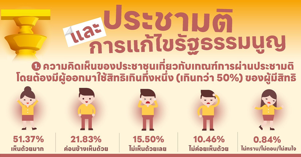 จากการสำรวจเมื่อถามความคิดเห็นของประชาชนเกี่ยวกับเกณฑ์การผ่านประชามติโดยต้องมีผู้ออกมาใช้สิทธิเกินกึ่งหนึ่ง หรือเกินกว่า 50 เปอร์เซ็นต์ ของผู้มีสิทธิ พบว่า ตัวอย่าง ร้อยละ 51.37 ระบุว่า เห็นด้วยมาก รองลงมา ร้อยละ 21.83 ระบุว่า ค่อนข้างเห็นด้วย ร้อยละ 15.50 ระบุว่า ไม่เห็นด้วยเลย ร้อยละ 10.46 ระบุว่า ไม่ค่อยเห็นด้วย และร้อยละ 0.84 ระบุว่า ไม่ทราบ,ไม่ตอบ,ไม่สนใจ