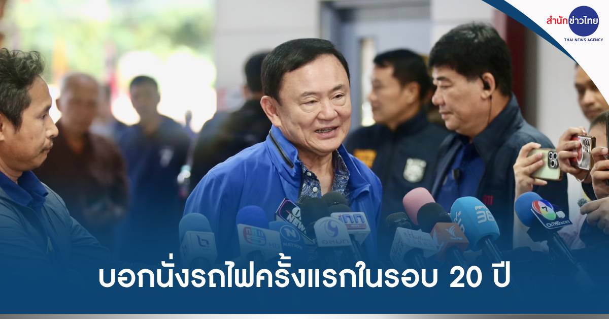 สถานีบางบำหรุ 13 ธ.ค.-“ทักษิณ” นั่งรถไฟสัมมนาเพื่อไทย หัวหิน บอกนั่งครั้งแรกในรอบ 20 ปี แซวสื่อที่เคยทำข่าวในอดีตยังไม่แก่ ขณะตนเองแก่และโทรม แจงไม่เปิดบ้านจันทร์ส่องหล้า อยากให้สื่อติดตามทำข่าว “นายกฯ อิ้งค์” มากกว่า พูดติดตลกหัวหน้าพรรคไทยรักไทย-เพื่อไทย เป็นคนเดียวกัน แต่ผมยาวกว่า