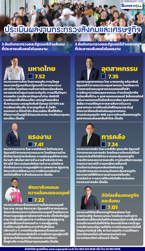 สำนักวิจัยซูเปอร์โพล เสนอผลสำรวจเรื่อง “ประเมินผลงานกระทรวงสังคมและเศรษฐกิจ” กรณีศึกษาตัวอย่างประชาชนทุกสาขาอาชีพทั่วประเทศ ดำเนินโครงการ รวมจำนวนตัวอย่างในการวิเคราะห์ทางสถิติทั้งสิ้น จำนวนทั้งสิ้น 1,156ตัวอย่าง ระหว่างวันที่ 10 – 14 ธันวาคม พ.ศ.2567ที่ผ่านมา โดยเมื่อถามถึงรัฐมนตรีประจำกระทรวงด้านสังคมที่ประชาชนพึงพอใจ 3 อันดับแรก พบว่า กระทรวงมหาดไทยโดยนายอนุทิน ชาญวีรกูล รองนายกรัฐมนตรีและรัฐมนตรีว่าการกระทรวงมหาดไทยได้คะแนนสูงสุดอันดับหนึ่ง เมื่อคะแนนเต็ม 10 คะแนน ได้ 7.52 คะแนน โดยมีผลงานด้านการจัดระเบียบสังคม ทลายแหล่งมั่วสุมตามสถานบันเทิง การแก้ไขปัญหายาเสพติด การเยียวยาปัญหาน้ำท่วม ภัยพิบัติ การพัฒนาพื้นที่ท่องเที่ยว เศรษฐกิจพอเพียง พึ่งพาตนเอง เศรษฐกิจสินค้าโอทอป (OTOP) และการพัฒนาท้องถิ่น สาธารณูปโภค น้ำ ไฟฟ้า ถนนหนทาง ที่ดินทำกิน สิ่งแวดล้อม พื้นที่สีเขียว ชีวิตความเป็นอยู่ทั่วไปของประชาชน การพัฒนาชุมชนและเมือง เป็นต้น