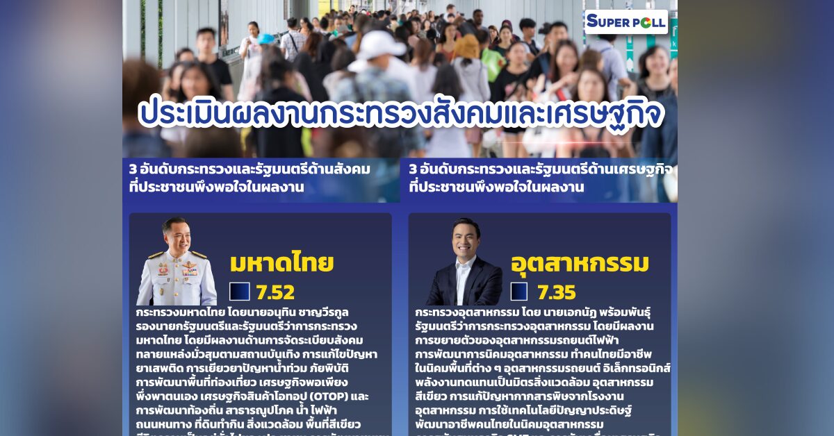 กรุงเทพฯ 15 ธ.ค.- ซูเปอร์โพล เผยผลสำรวจความคิดเห็น “อนุทิน” ผลงานเข้าตาได้คะแนน 7.52 เต็ม 10 กระทรวงด้านสังคม ชี้ทลายแหล่งมั่วสุมตามสถานบันเทิง เยียวยาน้ำท่วมภัยพิบัติ ส่วน “เอกนัฏ” ประชาชนพอใจด้านกระทรวงเศรษฐกิจ ขยายตัวอุตสาหกรรมรถยนต์ไฟฟ้า ตามด้วย “พิชัย” ขุนคลัง โดดเด่นแจกเงินดิจิทัล ส่งเสริมการลงทุน