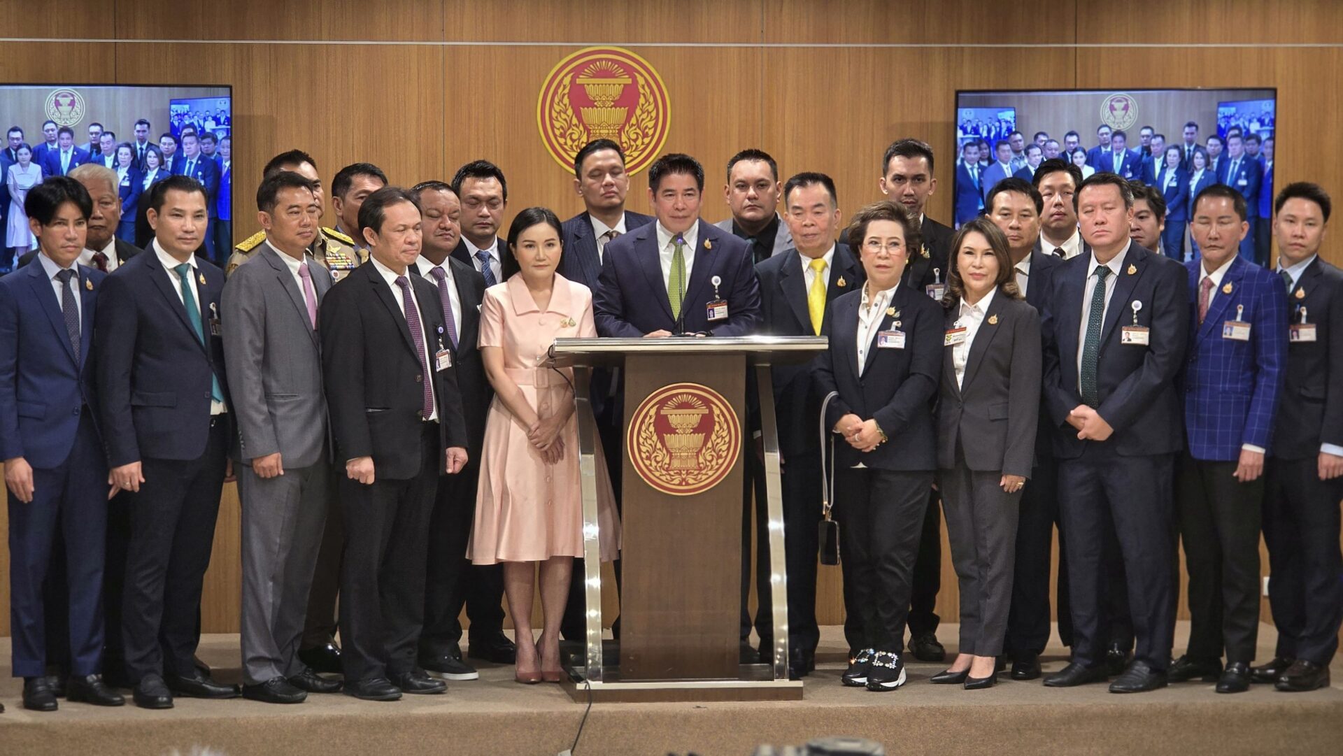 ร.อ.ธรรมนัส พรหมเผ่า แกนนำพรรคกล้าธรรม พร้อม น.ส.นฤมล ภิญโญสินวัฒน์ หัวหน้าพรรคกล้าธรรม พร้อม สส.พรรคทั้ง 24 คนแถลงร่วมกัน
