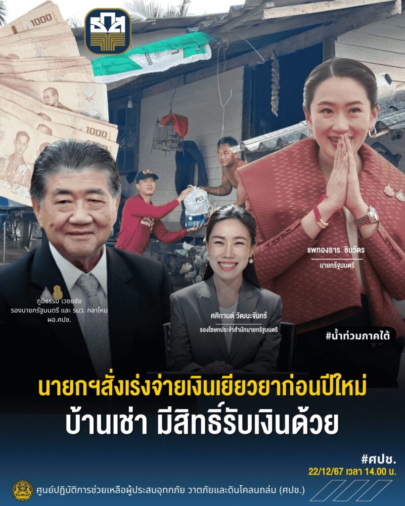 รองโฆษกประจำสำนักนายกรัฐมนตรี กล่าวเพิ่มเติมว่า ตามที่ นางสาวแพทองธาร ชินวัตร นายกรัฐมนตรี ได้มีข้อสั่งการให้กรมป้องกันและบรรเทาสาธารณภัยเร่งจ่ายเงินช่วยเหลือเยียวยาตามมติ ครม. เมื่อวันที่ 3 ธ.ค.67 ขณะนี้ มีการยื่นคำร้องมาแล้ว 857,308 ครัวเรือนซึ่งอยู่ระหว่างการพิจารณาของคณะกรรมการให้ความช่วยเหลือผู้ประสบภัยระดับอำเภอ (ก.ช.ภ.อ.) นำเสนอมาสู่ระดับจังหวัด (ก.ช.ภ.จ.) ก่อนส่งมายังกรมป้องกันและบรรเทาสาธารณภัยเพื่อส่งข้อมูลไปยังธนาคารออมสินและโอนจ่ายไปยังบัญชีพร้อมเพย์ตามเลขบัตรประจำตัวประชาชนภายในสิ้นเดือน ธ.ค.67