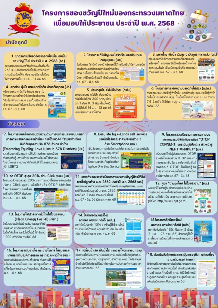 น.ส.ไตรศุลี ไตรสรณกุล เลขานุการ รมว.มหาดไทย และโฆษกระทรวงมหาดไทย กล่าวว่า เพื่อเป็นการส่งความสุขในเทศกาลปีใหม่ 2568 ไปพร้อมกับการขับเคลื่อนภารกิจบำบัดทุกข์ บำรุงสุขของกระทรวงมหาดไทย นายอนุทิน ชาญวีรกูล รองนายกรัฐมนตรี และ รมว.มหาดไทย ได้มอบหมายให้ส่วนราชการ รัฐวิสาหกิจ ในสังกัดกระทรวงมหาดไทย ตลอดจนกรุงเทพมหานคร จัดทำโครงการที่เป็นประโยชน์ ช่วยเหลือ แบ่งเบาภาระอย่างยั่งยืน เป็นของขวัญเพื่อส่งมอบแก่พี่น้องประชาชนทั่วประเทศในเทศกาลปีใหม่ 2568
