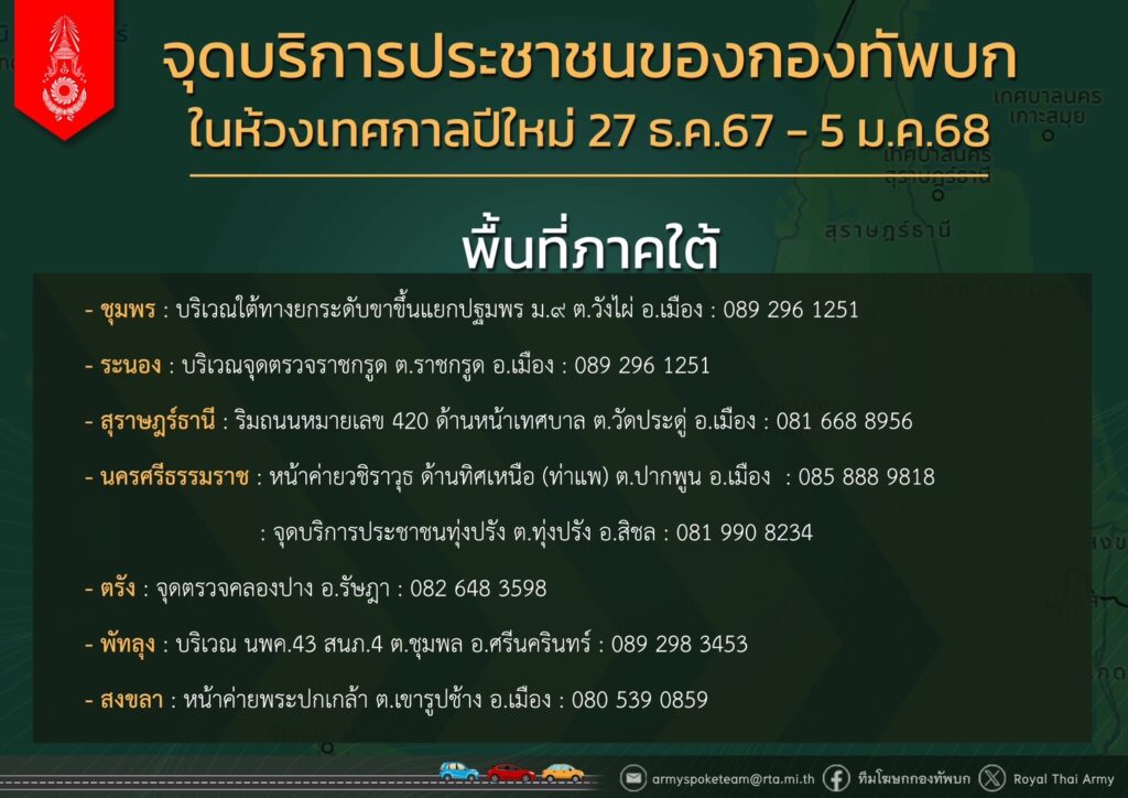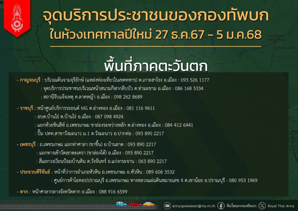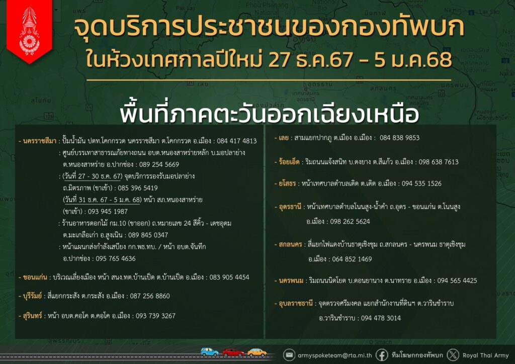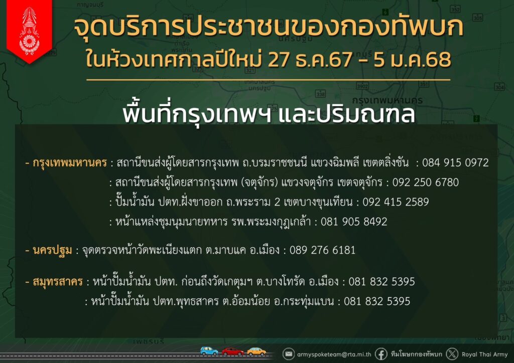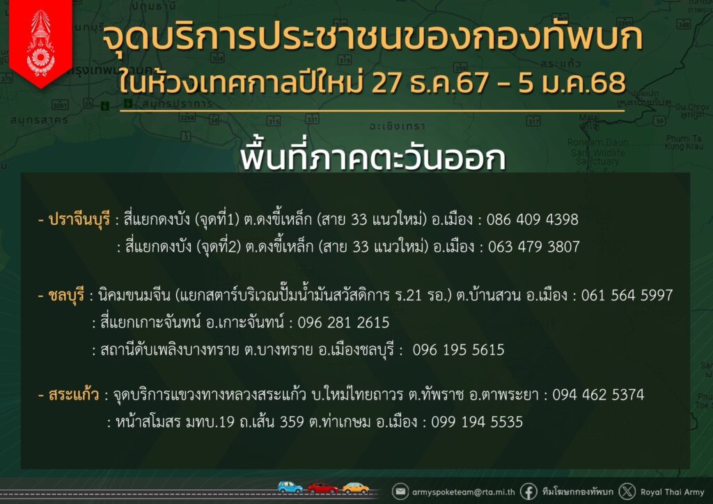 ร.อ.หญิง จุฑาพัชร เปรมบัญญัติ ผช.โฆษก กองทัพบก เปิดเผยว่า ในช่วงเทศกาลปีใหม่นี้ กองทัพบกร่วมกับศูนย์อำนวยการป้องกันและลดอุบัติเหตุทางถนน กรมป้องกันและบรรเทาสาธารณภัย กระทรวงมหาดไทย จัดตั้งจุดบริการประชาชนแบบครบวงจร ตั้งแต่ 27 ธ.ค.67 – 5 ม.ค.68 ในพื้นที่ กรุงเทพและปริมณฑล 7 จุด ภาคเหนือ 12 จุด ภาคกลาง 17 จุด ภาคตะวันออกเฉียงเหนือ 15 จุด ภาคตะวันออก 7 จุด ภาคตะวันตก 13 จุด และภาคใต้ 8 จุด รวม 79 จุด เพื่อดูแลความปลอดภัย และให้บริการประชาชนในการเดินทาง ทั้งในเส้นทางหลัก และเส้นทางที่เป็นจุดเสี่ยงหรือพบอุบัติเหตุบ่อยครั้ง