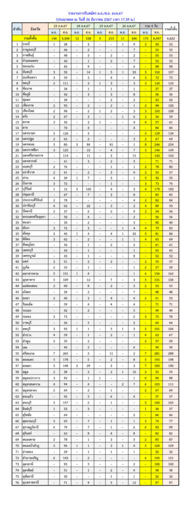 26 ธ.ค.- กกต. เผยยอดผู้สมัครเลือกตั้ง อบจ. ทั่วประเทศ 4 วัน รวม 6,622 คน นายก อบจ. 175 คน นครพนม มากสุด