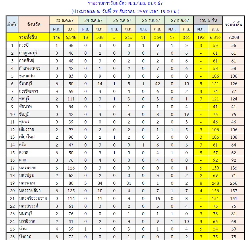 กกต. 27 ธ.ค. – กกต. เผยยอดผู้สมัครเลือกตั้ง อบจ.ทั่วประเทศ รวม 7,008 คน แยกเป็นนายก อบจ. 192 คน สมาชิก 6,816 คน
