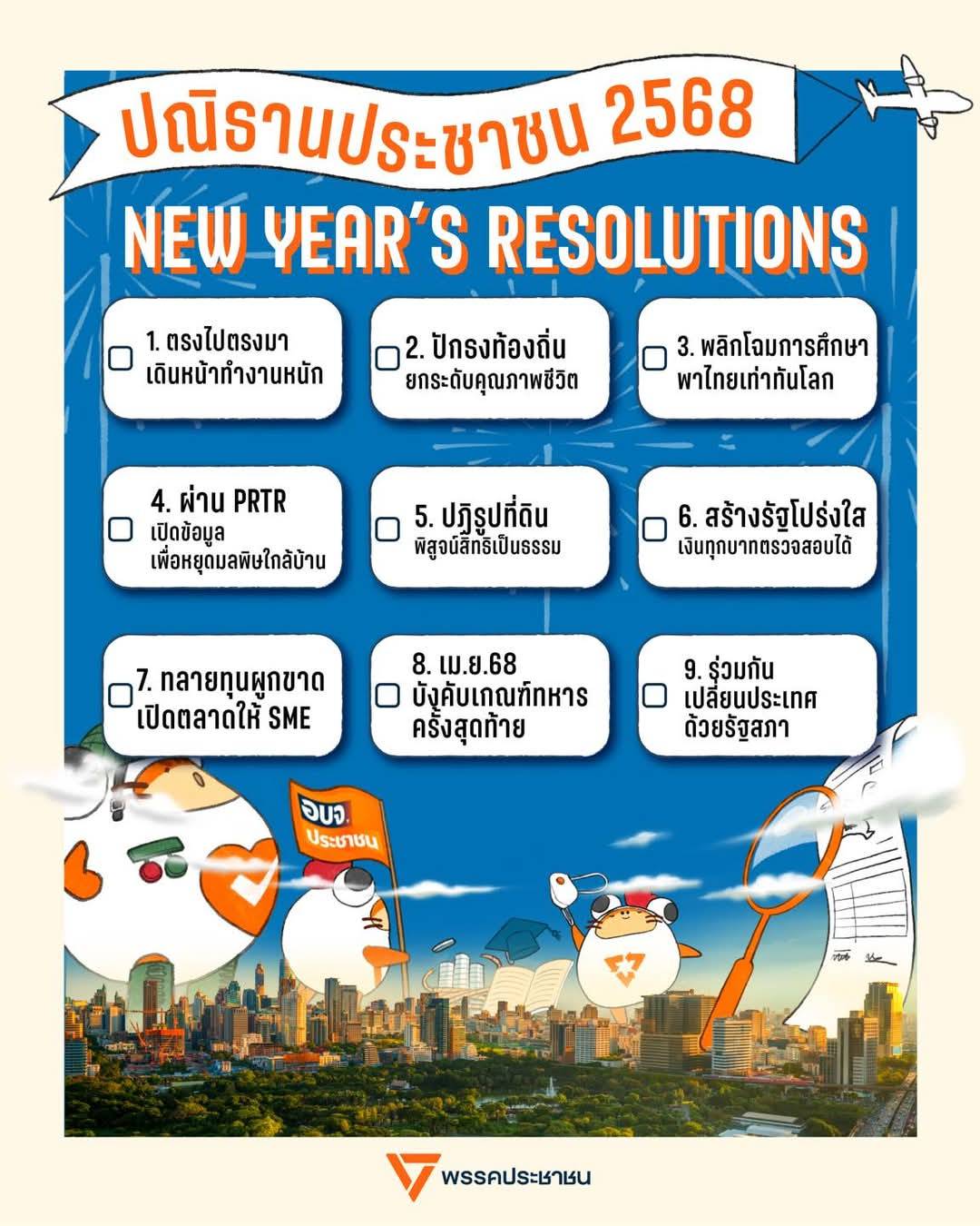 ผู้สื่อข่าวรายงานว่า พรรคประชาชนได้เผยแพร่ปณิธานพรรค 9 ข้อ ในโอกาสเริ่มต้นปี 2568 ที่มุ่งมั่นอยากทำให้สำเร็จ ผ่านทางโซเชียลมีเดียของพรรค ซึ่ง 9 ข้อ ประกอบด้วย