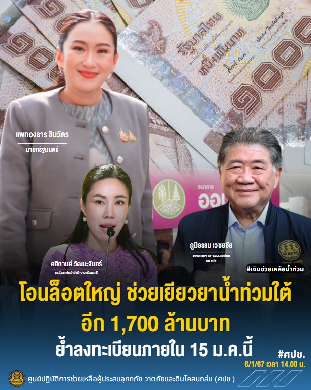 “กรมป้องกันและบรรเทาสาธารณภัยคาดว่าธนาคารออมสิน จะโอนเงินช่วยเหลือผู้ประสบภัยฯ ครั้งที่ 5 ให้ประชาชนในพื้นที่ จ.พัทลุง ตรัง สงขลา และยะลา จำนวน 71,422 ครัวเรือน ในวันที่ 6 ม.ค. 68 และโอนเงินช่วยเหลือผู้ประสบภัยฯ ครั้งที่ 6 ให้ประชาชนในพื้นที่ จ.สงขลา นครศรีธรรมราช และยะลา จำนวน 121,835 ครัวเรือน ในวันที่ 7 ม.ค. 68