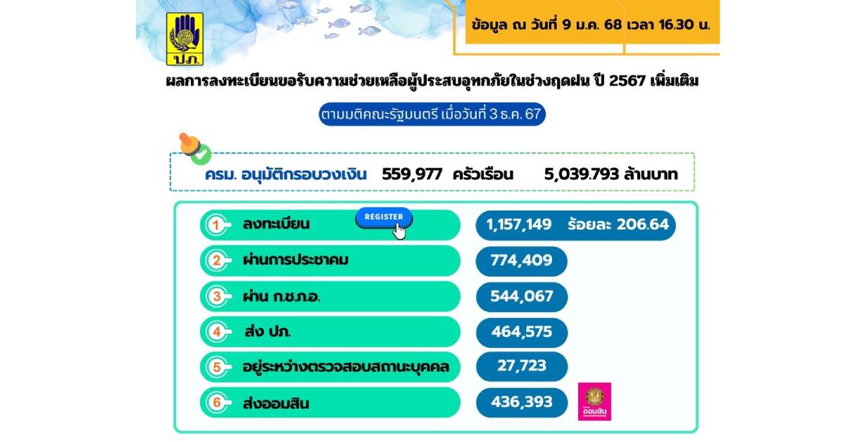นายภาสกร บุญญลักษม์ อธิบดีกรมป้องกันและบรรเทาสาธารณภัย (ปภ.) เปิดเผยว่า จากที่คณะรัฐมนตรีได้เห็นชอบหลักเกณฑ์ เงื่อนไข และวิธีการจ่ายเงินช่วยเหลือประชาชนผู้ประสบอุทกภัยในช่วงฤดูฝน ปี 2567 ครัวเรือนละ 9,000 บาท เพิ่มเติม เมื่อวันที่ 3 ธันวาคม 2567 โดยข้อมูลเมื่อวันที่ 9 ม.ค. 68 เวลา 16.30 น. ธนาคารออมสินได้โอนเงินเข้าบัญชีผู้ประสบภัย รอบที่ 7 เรียบร้อยแล้ว โดยสรุปภาพรวมการจ่ายเงินช่วยเหลือประชาชนผู้ประสบอุทกภัยในช่วงฤดูฝน ปี 2567 ตามมติคณะรัฐมนตรี เมื่อวันที่ 3 ธันวาคม 2567 มีประชาชนลงทะเบียนขอรับเงินช่วยเหลือทั้งสิ้น 1,157,149 ครัวเรือน ผ่านการประชาคมหมู่บ้านแล้ว 774,409 ครัวเรือน ผ่านการประชุมคณะกรรมการให้ความช่วยเหลือผู้ประสบภัยพิบัติอำเภอ (ก.ช.ภ.อ.) แล้ว 544,067 ครัวเรือน และผ่านการประชุมคณะกรรมการให้ความช่วยเหลือผู้ประสบภัยพิบัติจังหวัด (ก.ช.ภ.จ.) และส่งข้อมูลให้ ปภ. แล้ว จำนวน 464,575 ครัวเรือน ซึ่ง ปภ. ส่งข้อมูลให้ธนาคารออมสินแล้วจำนวน 436,393 ครัวเรือน และธนาคารออมสินโอนเงินให้ผู้ประสบภัยแล้ว 7 ครั้ง จำนวน 409,367 ครัวเรือน เป็นเงินกว่า 3,684.303 ล้านบาท