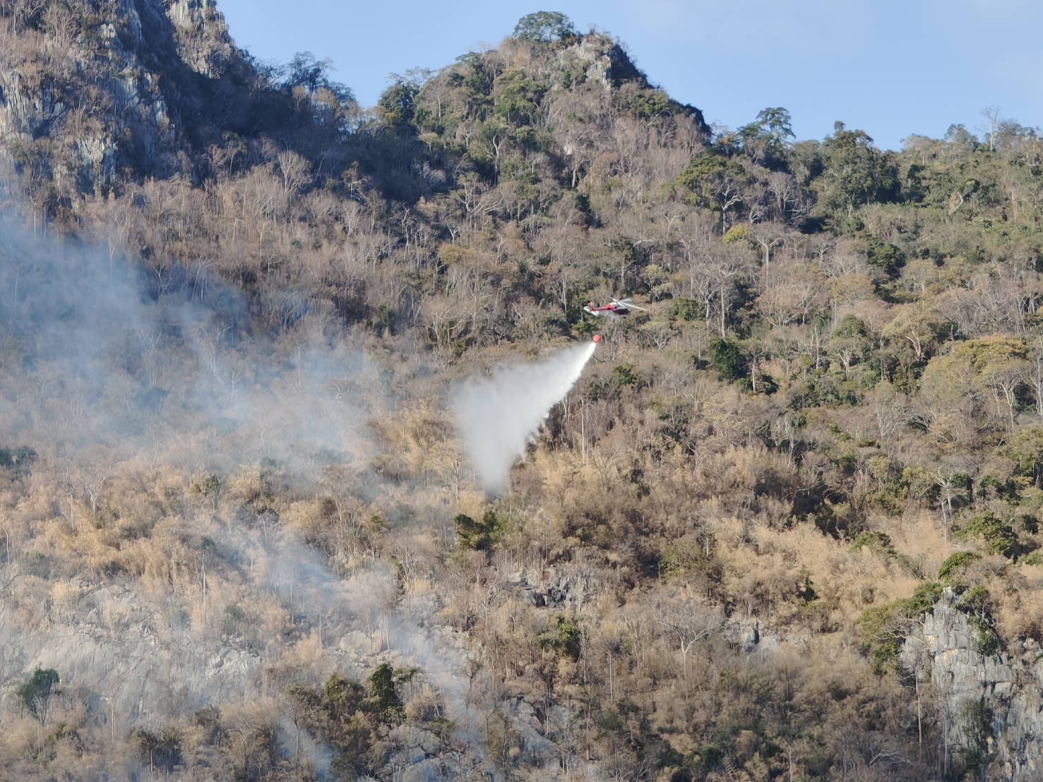 - ทั้งนี้ได้รับการสนับสนุนอากาศยาน (เฮลิคอปเตอร์) จากกระทรวงทรัพยากรฯ โดยจะทำการโปรยน้ำเพื่อลดความร้อน บริเวณหน้าผาที่เข้าไม่ถึง