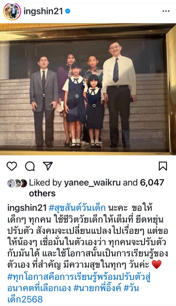 นางสาวแพทองธาร ชินวัตร นายกรัฐมนตรี โพสต์ภาพครอบครัวพร้อมหน้าพร้อมตากันสมัยวัยเด็ก กับคุณพ่อ คุณแม่ และพี่น้องทั้งสามคน ทั้งนายทักษิณ ชินวัตร คุณหญิงพจมาน ดามาพงศ์ นายพานทองแท้ ชินวัตร นางสาวพินทองทา ชินวัตร คุณากรวงศ์ พร้อมระบุข้อความว่า สุขสันต์วันเด็ก นะคะ ขอให้เด็กๆ ทุกคน ใช้ชีวิตวัยเด็กให้เต็มที่ ยืดหยุ่น ปรับตัว สังคมจะเปลี่ยนแปลงไปเรื่อยๆ แต่ขอให้น้องๆ เชื่อมั่นในตัวเองว่า ทุกคนจะปรับตัวกับมันได้ และใช้โอกาสนั้นเป็นการเรียนรู้ของตัวเอง ที่สำคัญมีความสุขในทุกๆ วันค่ะ♥️