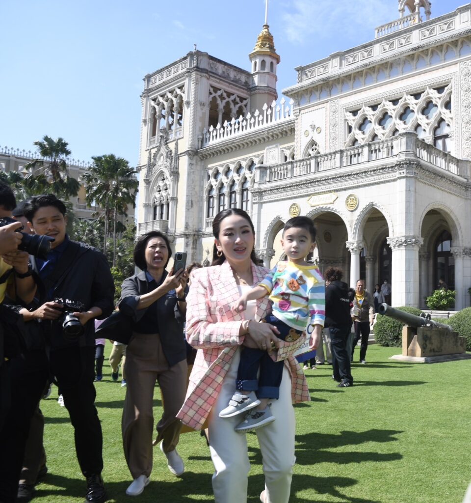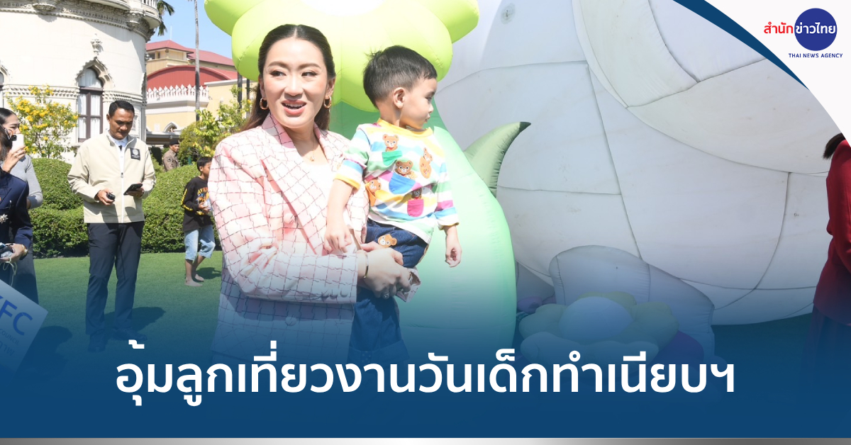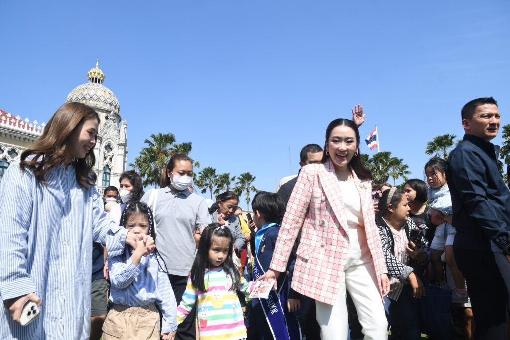 นางสาวแพทองธาร ชินวัตร นายกรัฐมนตรี พร้อมด้วยนายปิฎก สุขสวัสดิ์ สามี และเด็กหญิงธิธาร และเด็กชายพฤจ์ธาษิณ ลูกสาว-ลูกชาย ลงมาจากตึกไทยคู่ฟ้า ถ่ายรูปบริเวณสนามหญ้าด้านหน้าตึก ที่มีตุ๊กตาลมน้องหมูเด้งจัดแสดงอยู่ โดยมีผู้ปกครองที่พาลูกหลานมาเที่ยวงานวันเด็กที่ทำเนียบรัฐบาล มาร่วมถ่ายรูปเซลฟี่กับนายกรัฐมนตรี